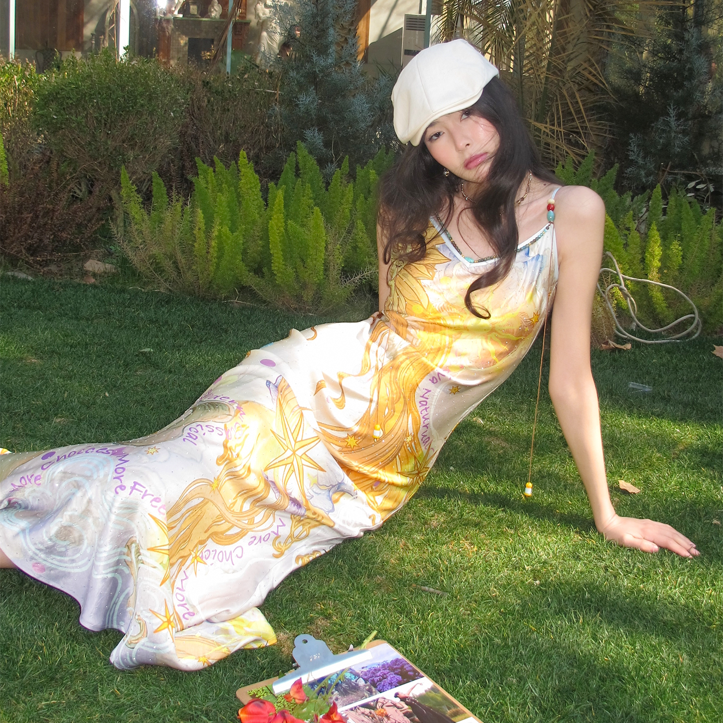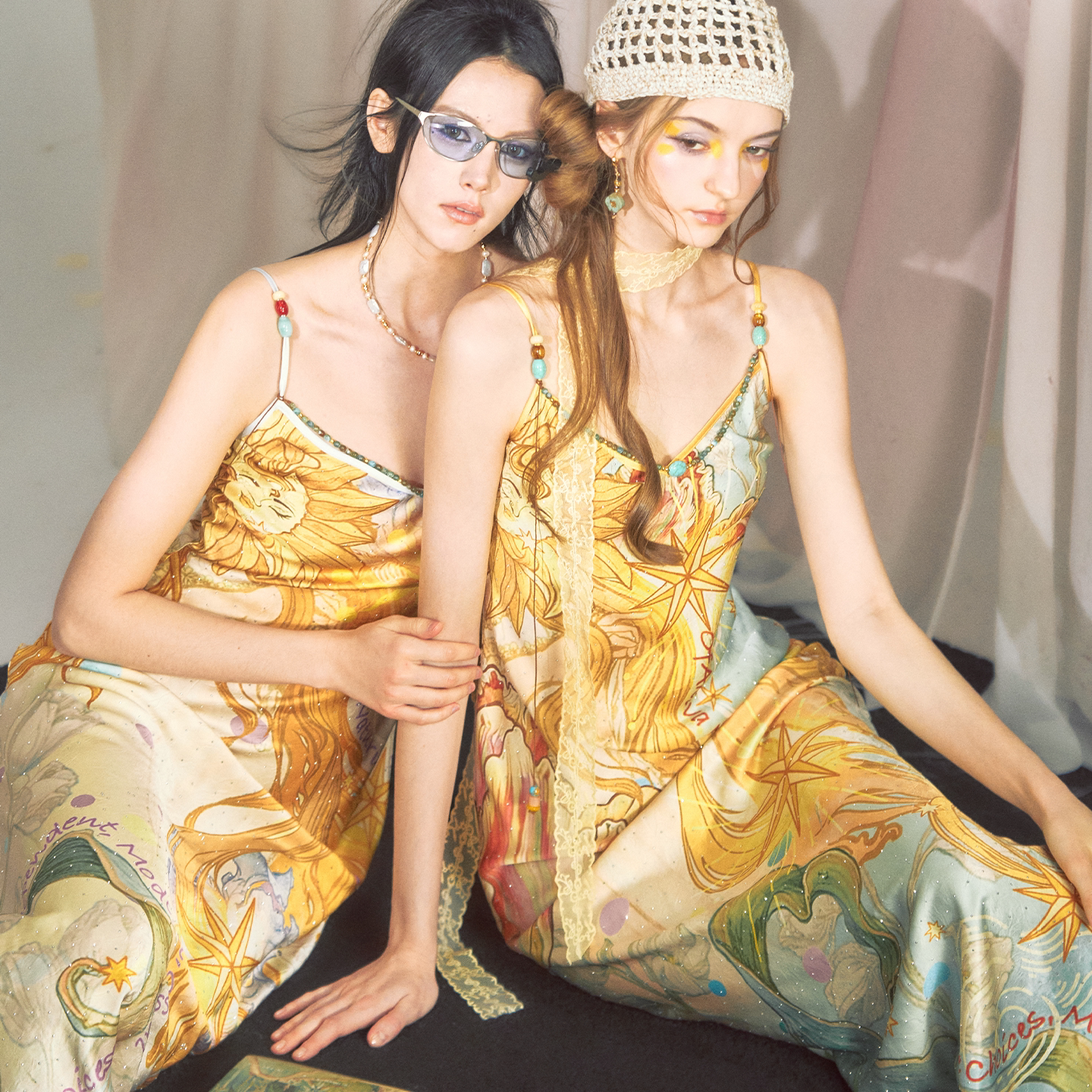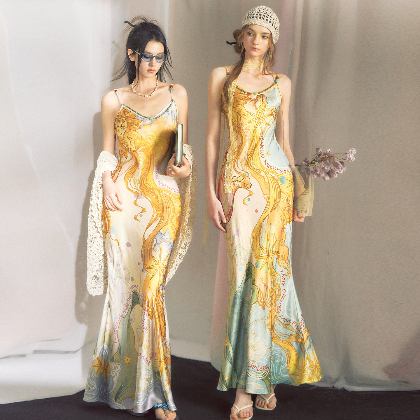 OfAkiva 闪耀烫钻神秘主义印花串珠连衣裙女V领吊带长裙 桑德罗