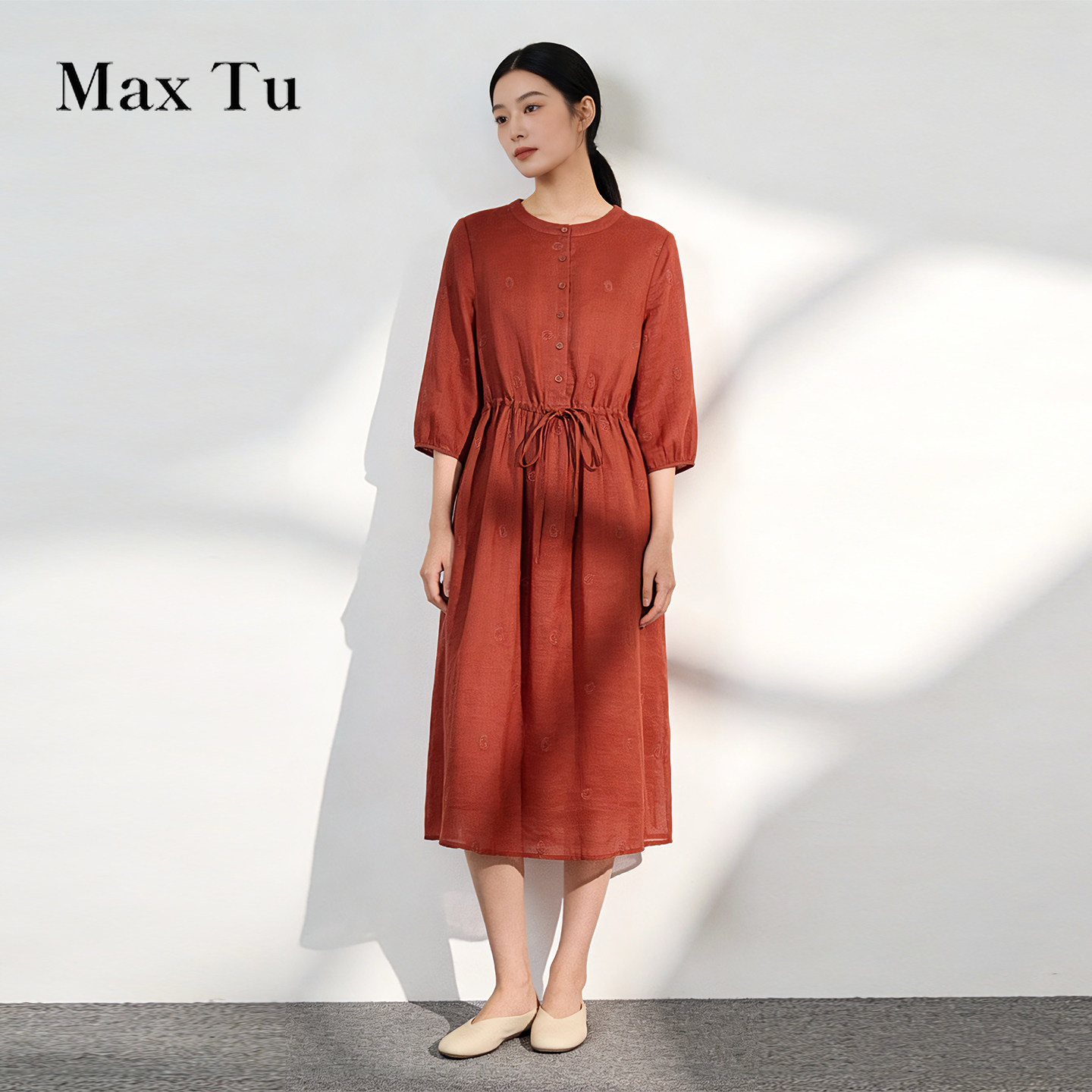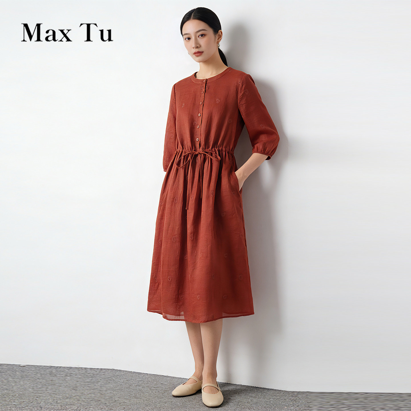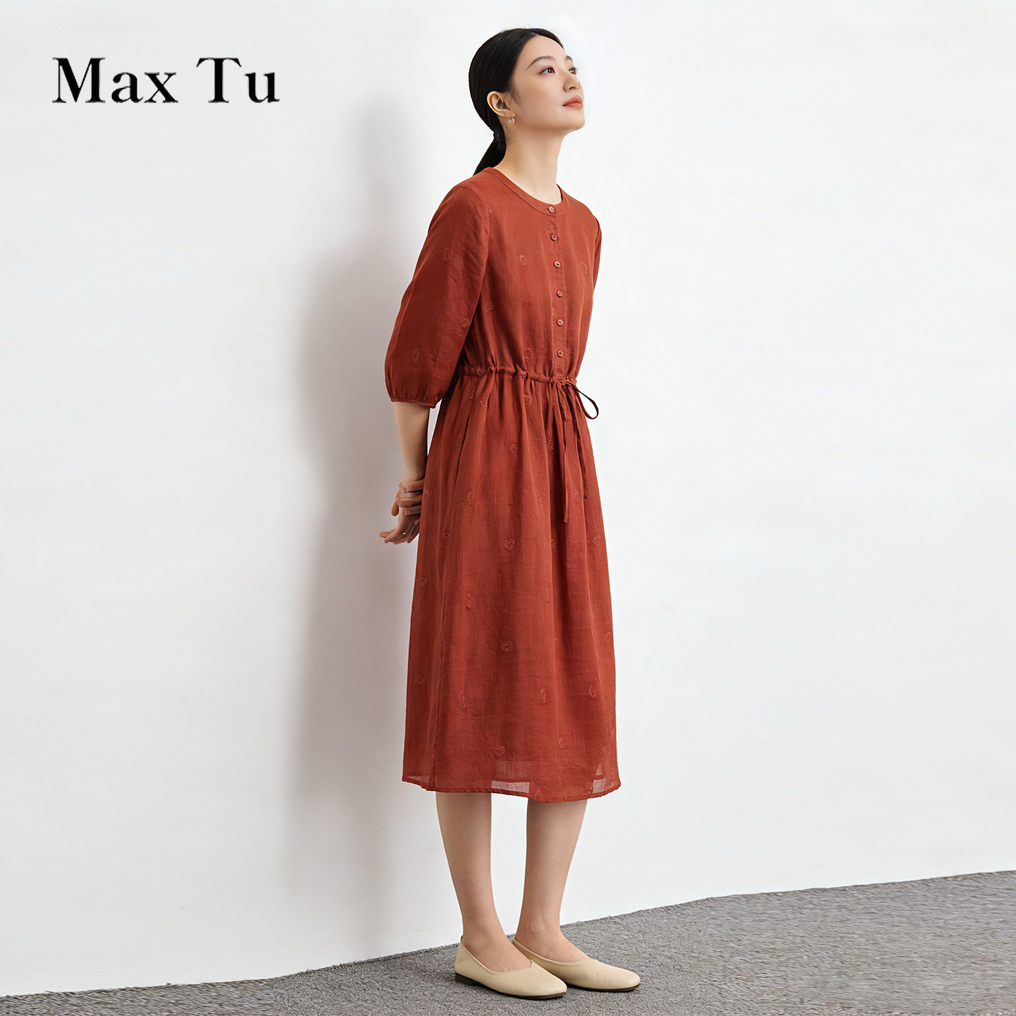 连衣裙 2026春夏收腰显瘦温柔慵懒风刺绣水洗苎麻七分袖 Max Tu女装