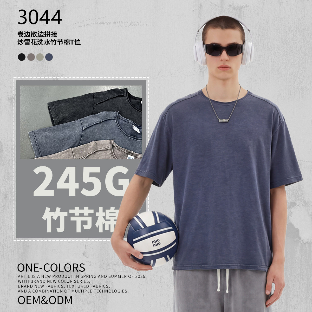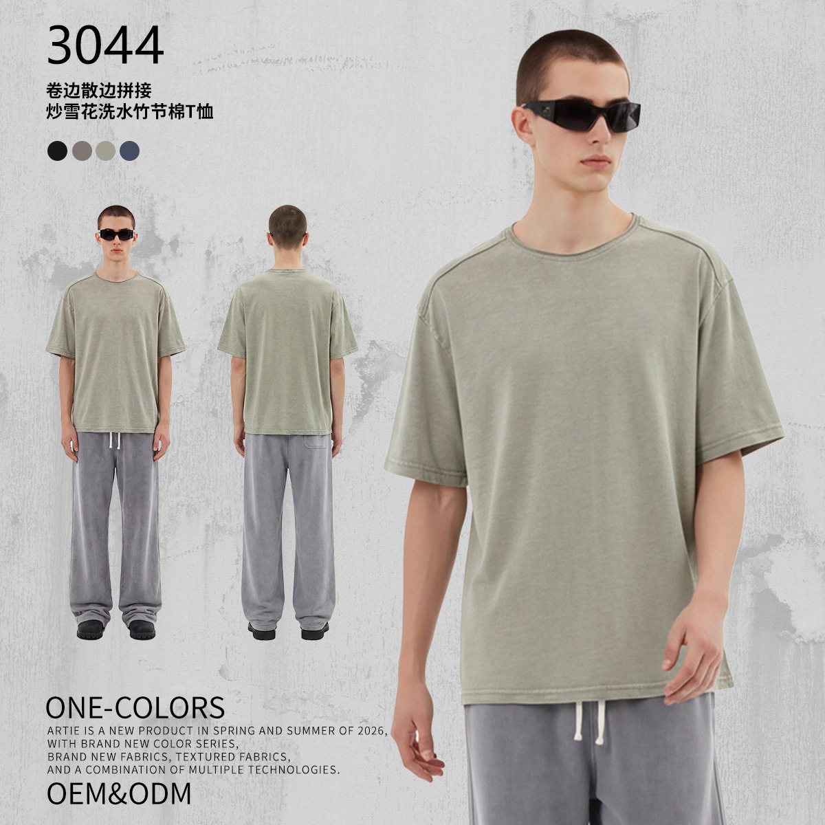 潮牌雪花洗水竹节棉T恤 复古卷边散边拼接工艺245g宽松透气短袖