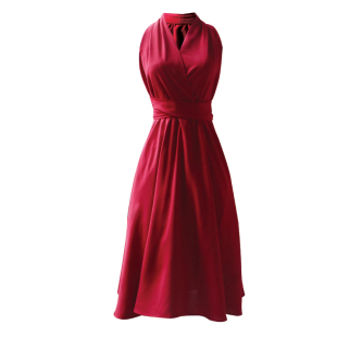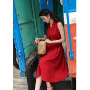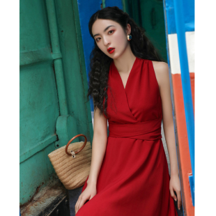 JUJU赫本复古港风裙子V领挂脖收腰显瘦法式 气质红色连衣裙女夏季