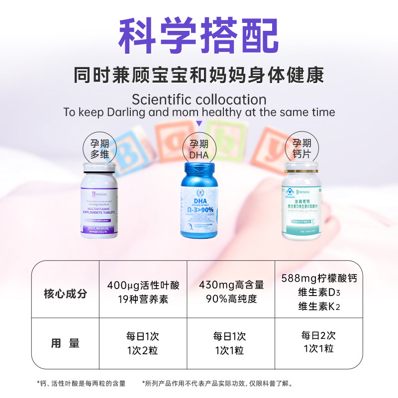 组合装 法澜秀孕妇dha活性叶酸多维维生素DK柠檬酸钙补钙全孕期