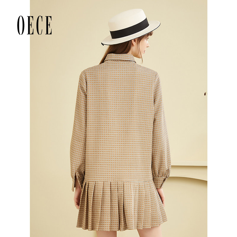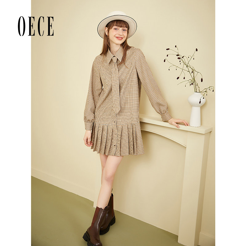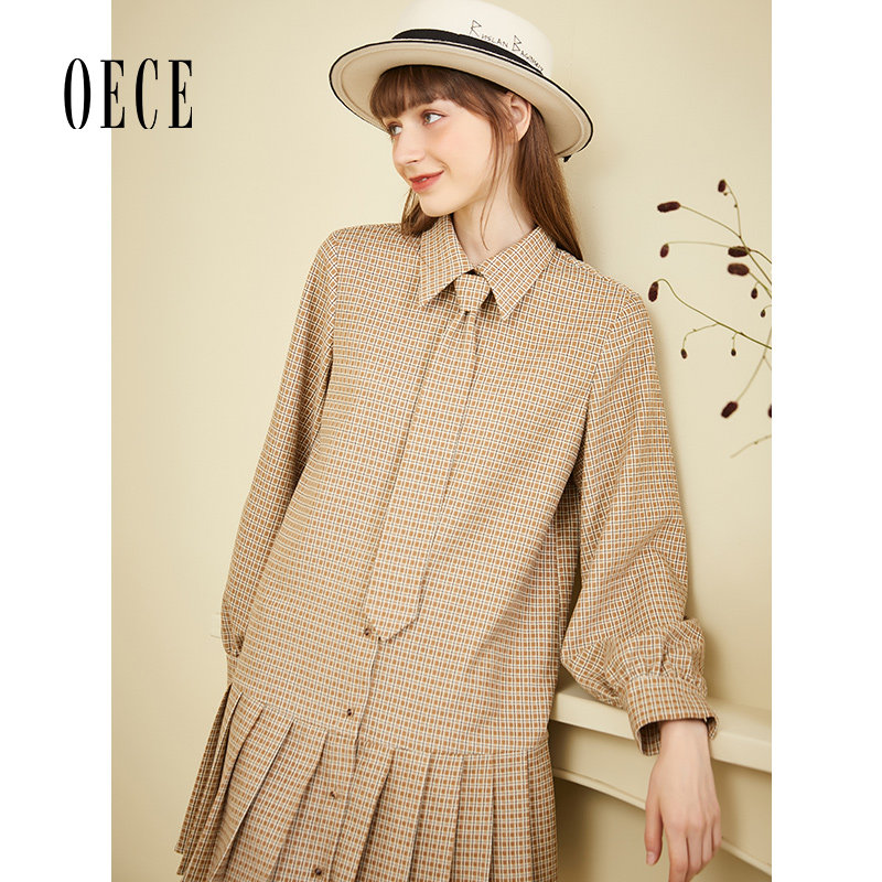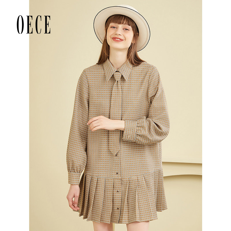 连衣裙 复古格子百褶裙气质裙子长袖 Oece衬衫 裙秋冬季