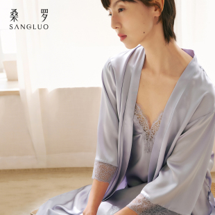 桑罗100%桑蚕丝真丝吊带睡裙睡袍两件套家居服送礼盒装 法式 性感