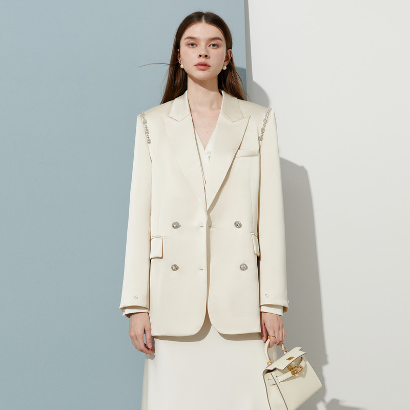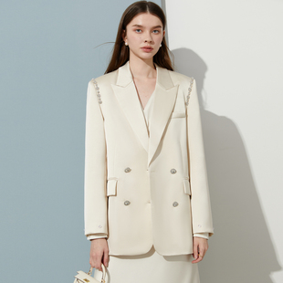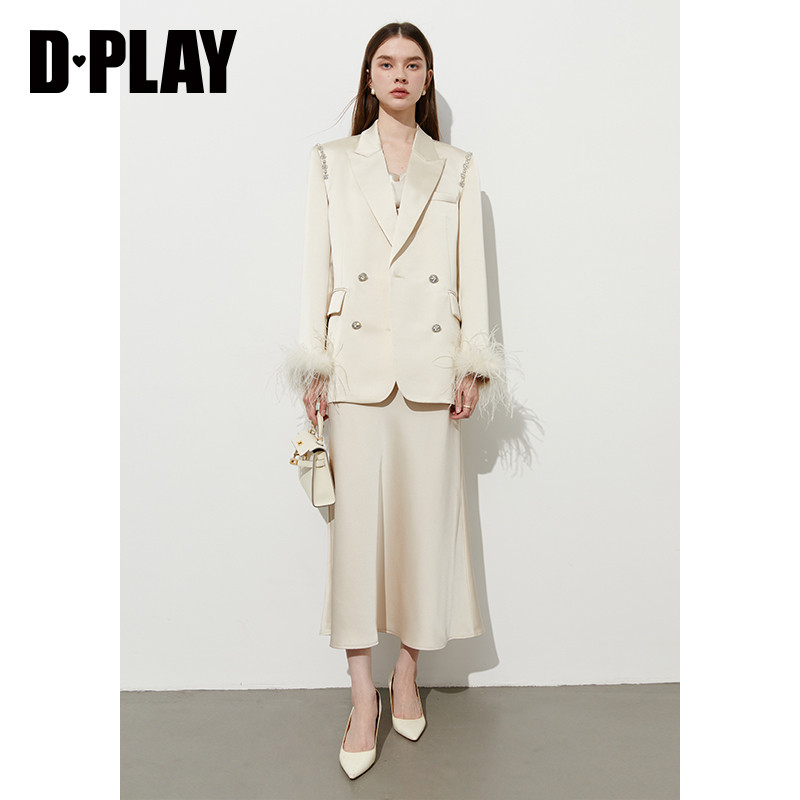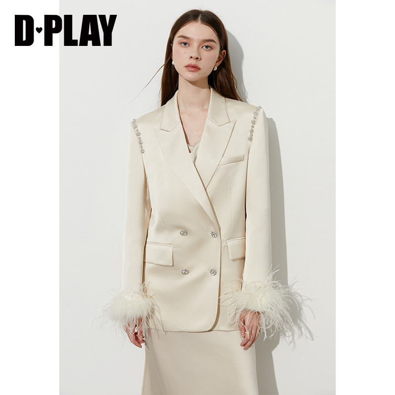 富家千金风西服搭配礼服女士外套 白色缎面羽毛西装 DPLAY 黑标