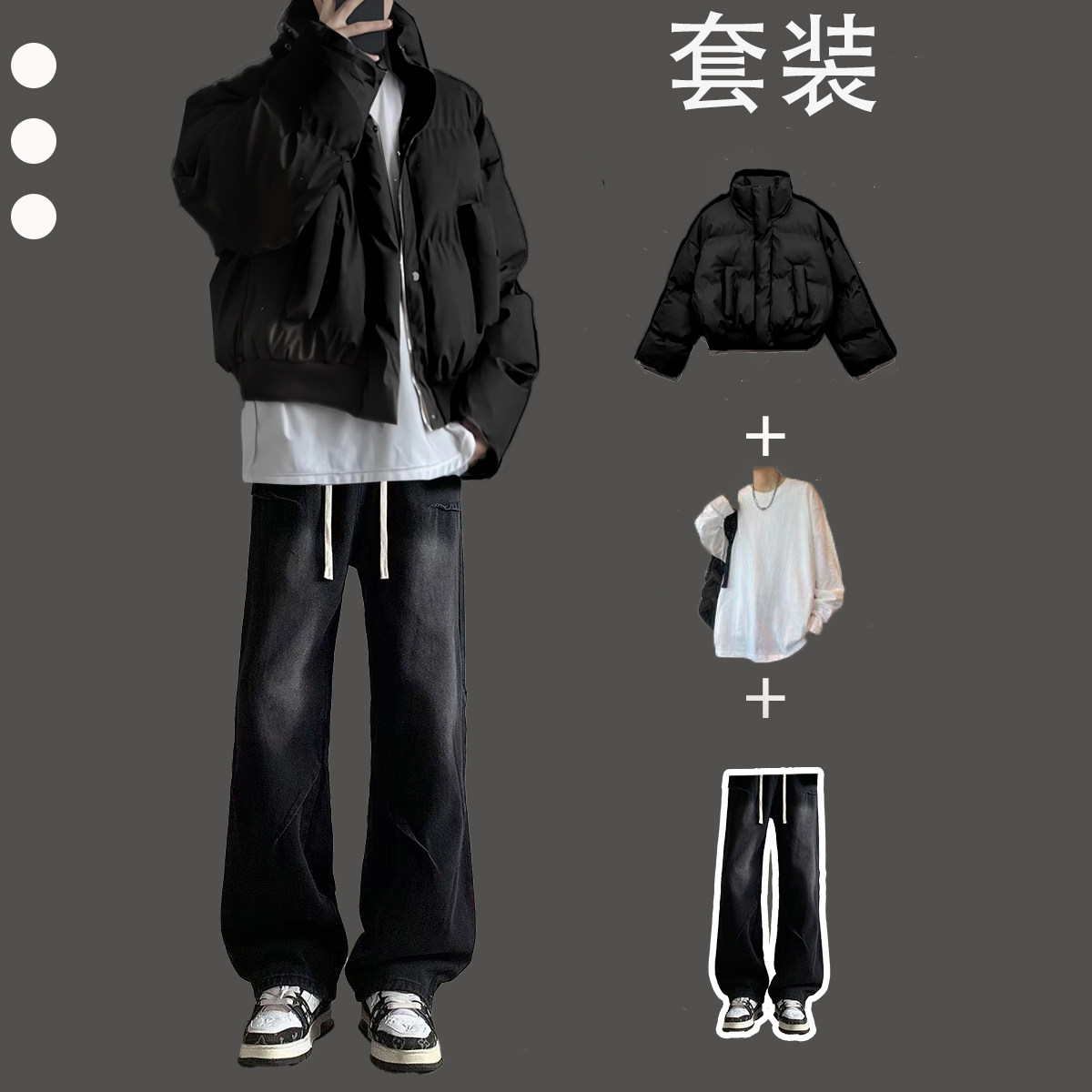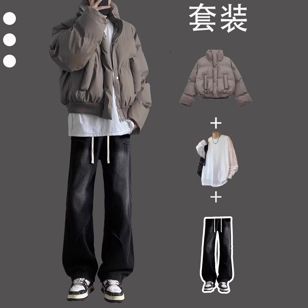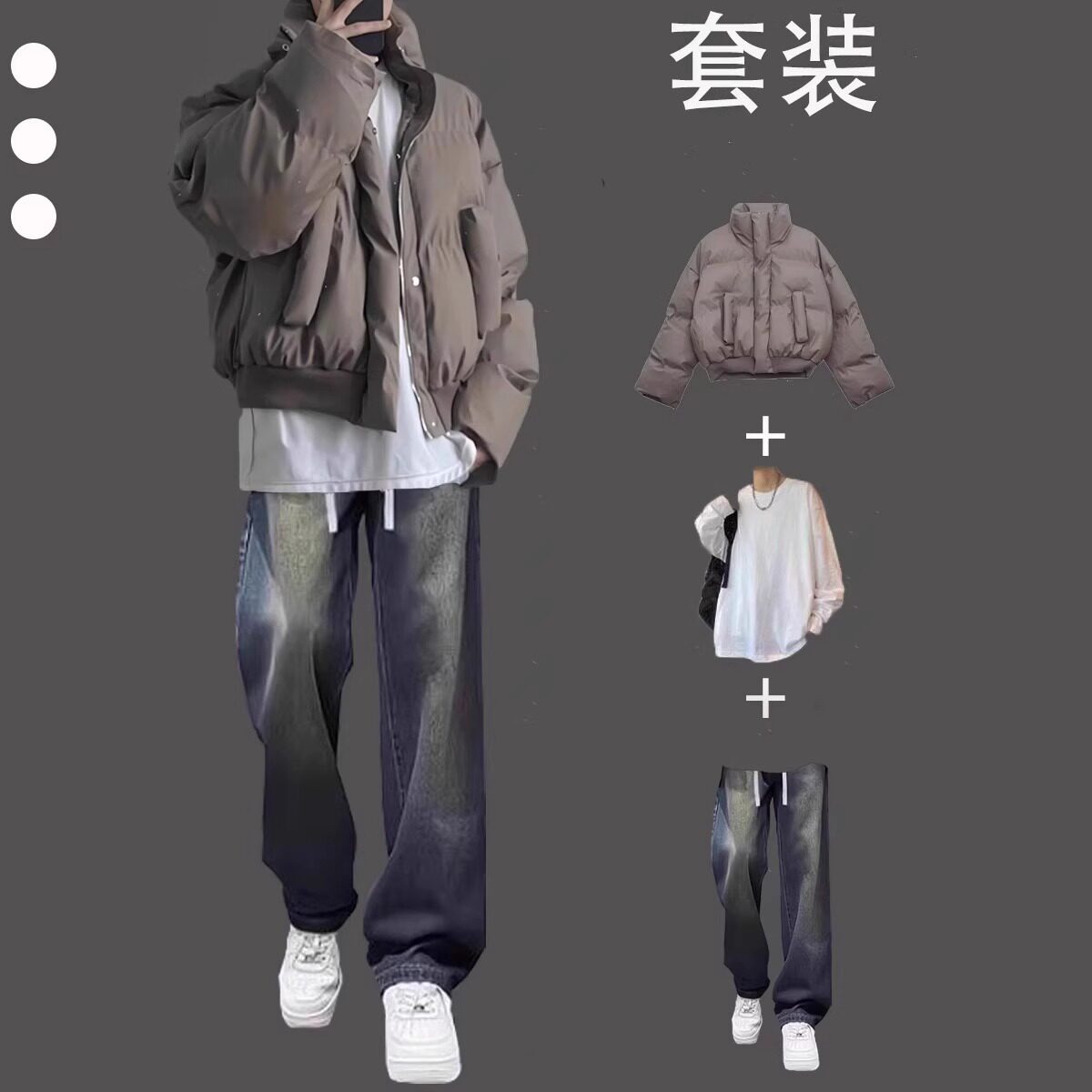 短款 美式 冬季 套装 面包服高级感小众设计棉服外套 高街pu皮棉衣男款
