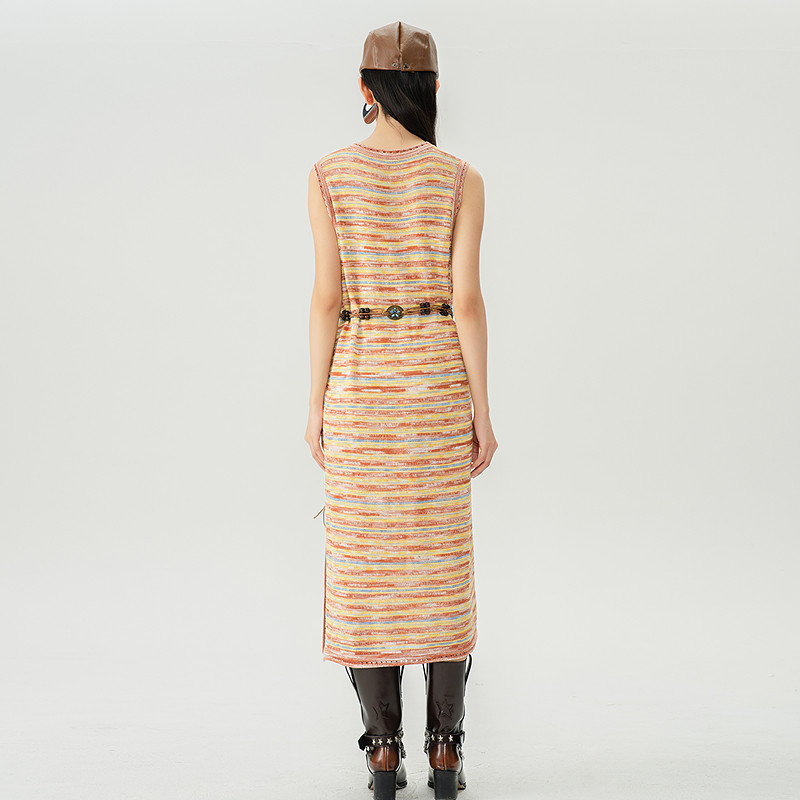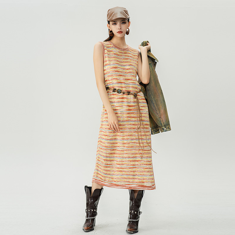 曼诺比菲商场同款 背心长裙 春秋条纹毛织连衣裙无袖