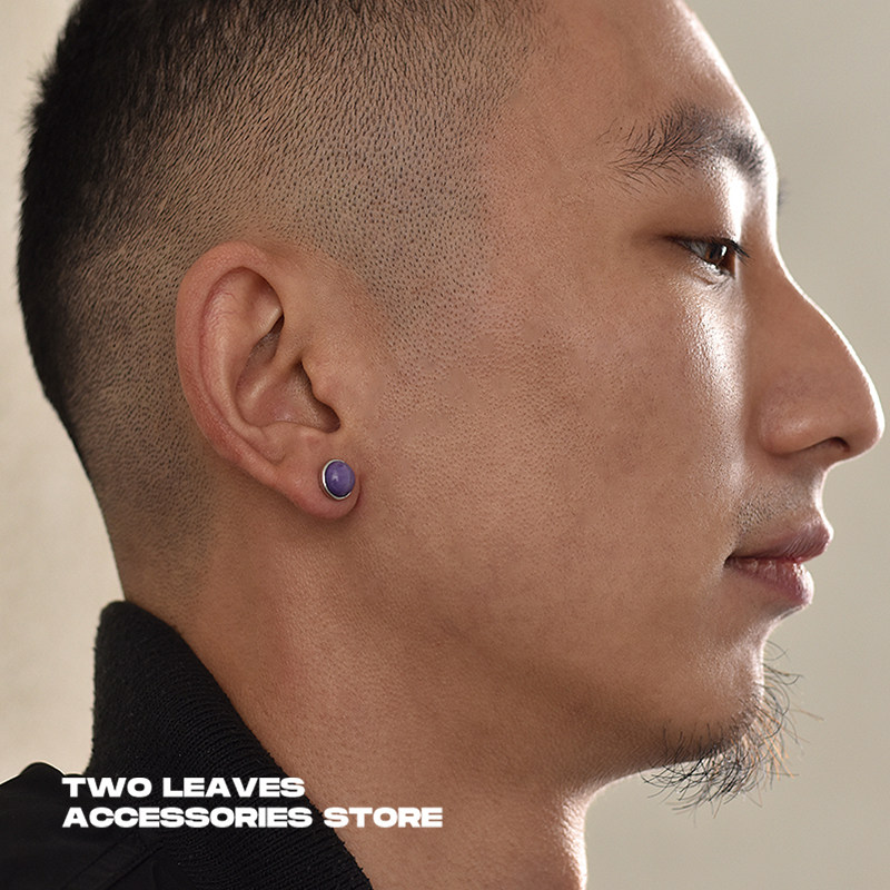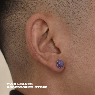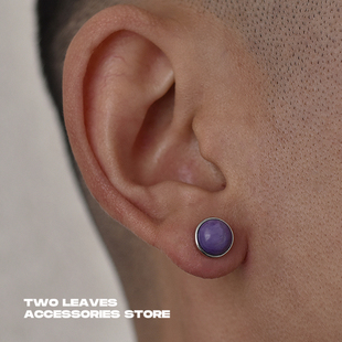 街头嘻哈欧美男女潮耳饰 S925纯银紫龙晶耳钉圆形个性 TWO LEAVES