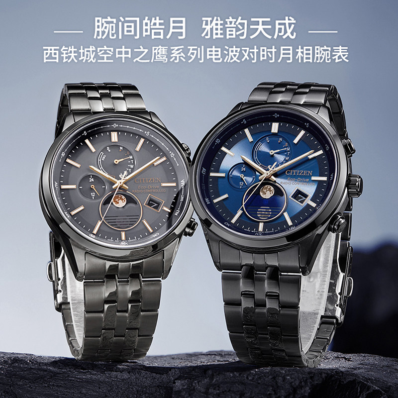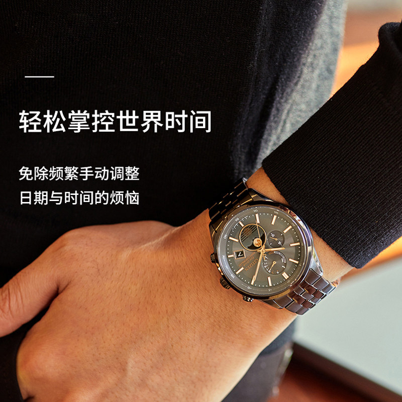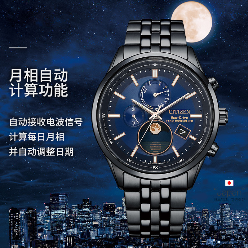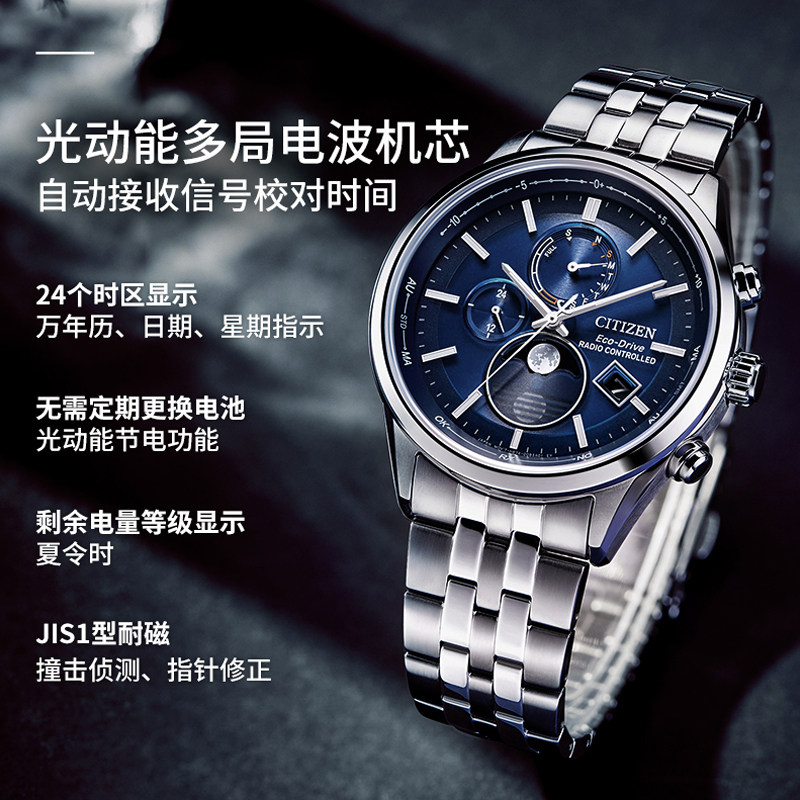 光动能电波计时月相钢带男表BY1030 citizen西铁城手表男 自营