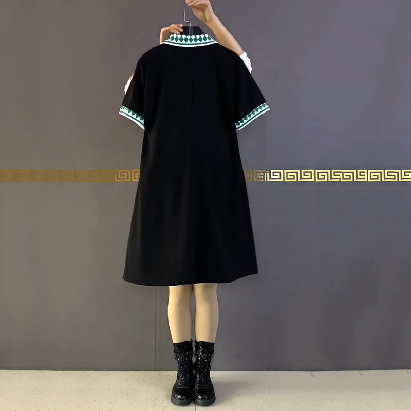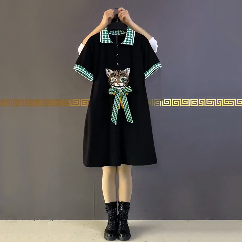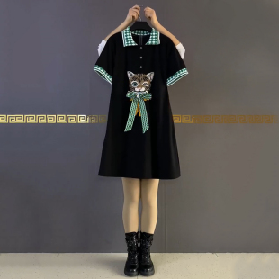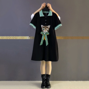 加肥加大胖妹妹2026新款 翻领连衣裙 学院风卡通猫咪蝴蝶结菱格短袖