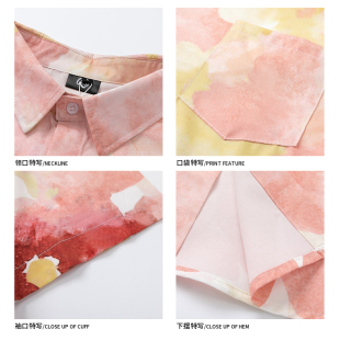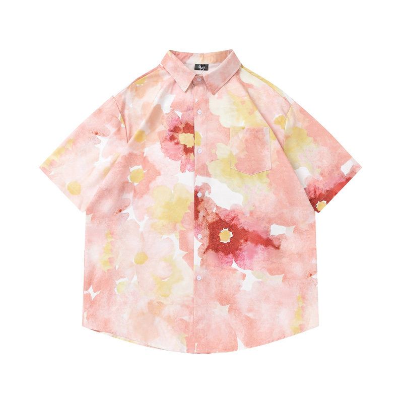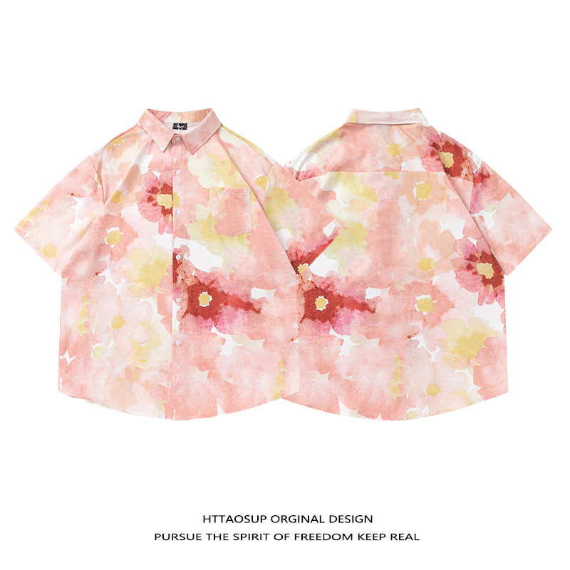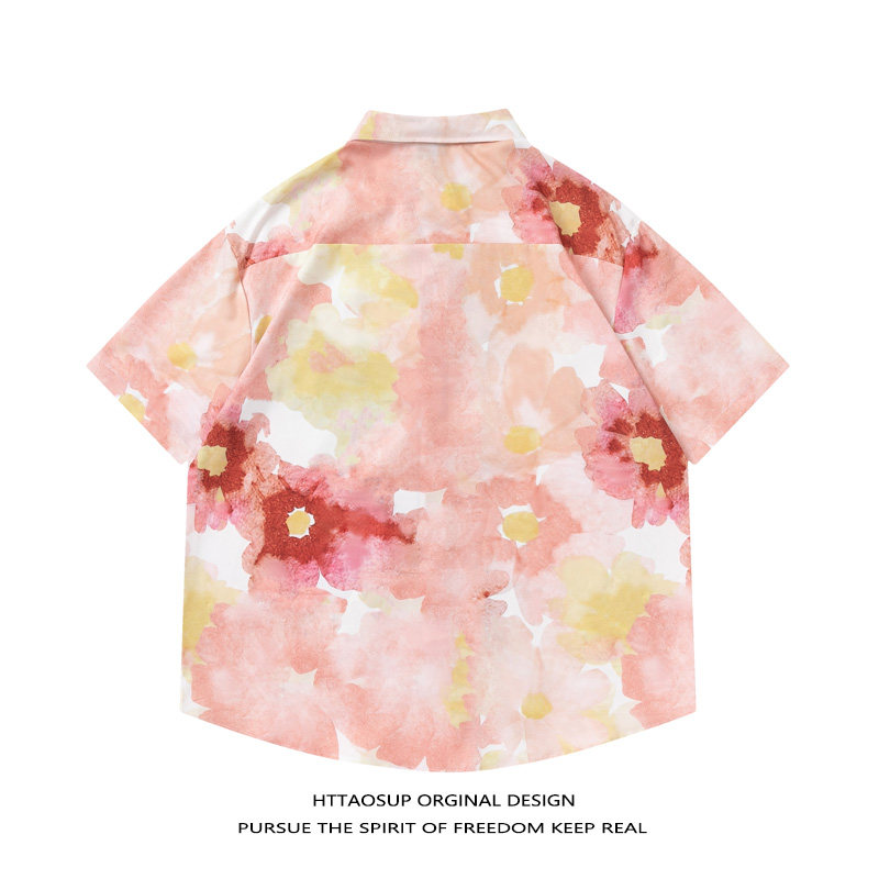 HTTAOSUP日系复古扎染花朵满印短袖 男女宽松潮牌情侣百搭衬衣 衬衫