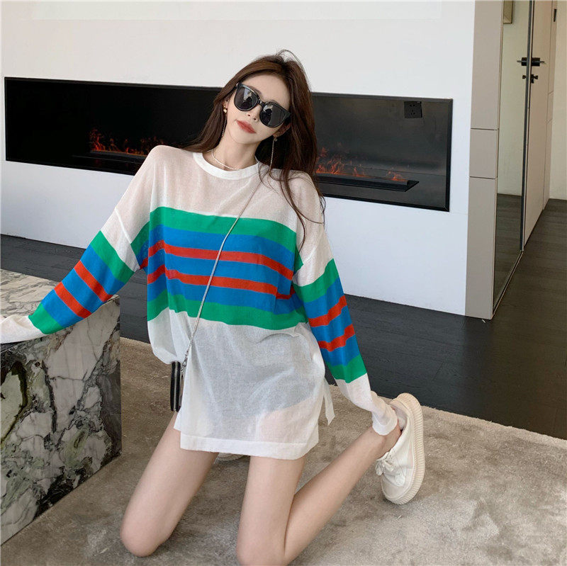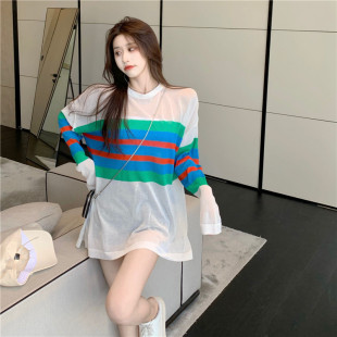 夏季 上衣长袖 2024年薄款 韩版 宽松冰丝T恤 针织罩衫 条纹防晒衣女款