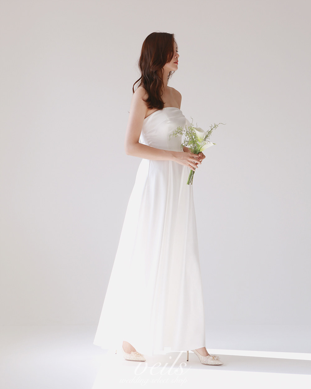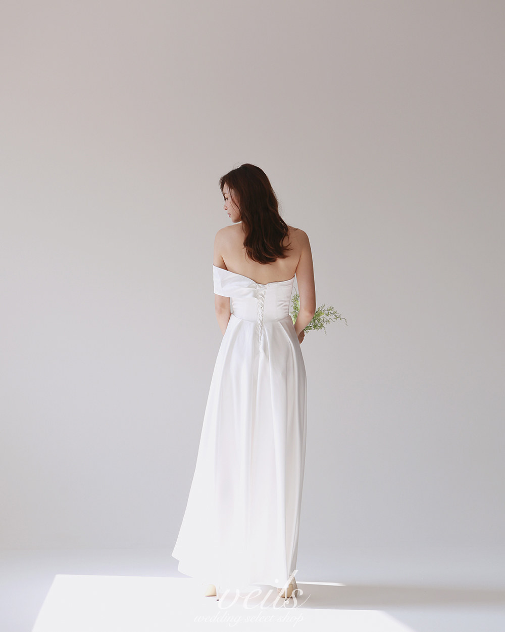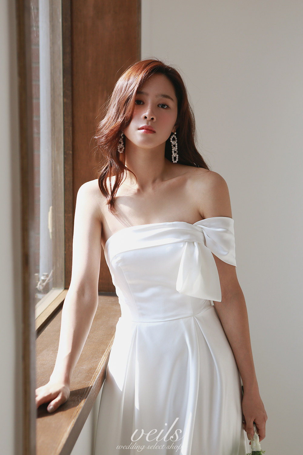 Veils白色气质简约缎面单肩蝴蝶结轻婚纱新娘旅拍户外婚礼小礼服