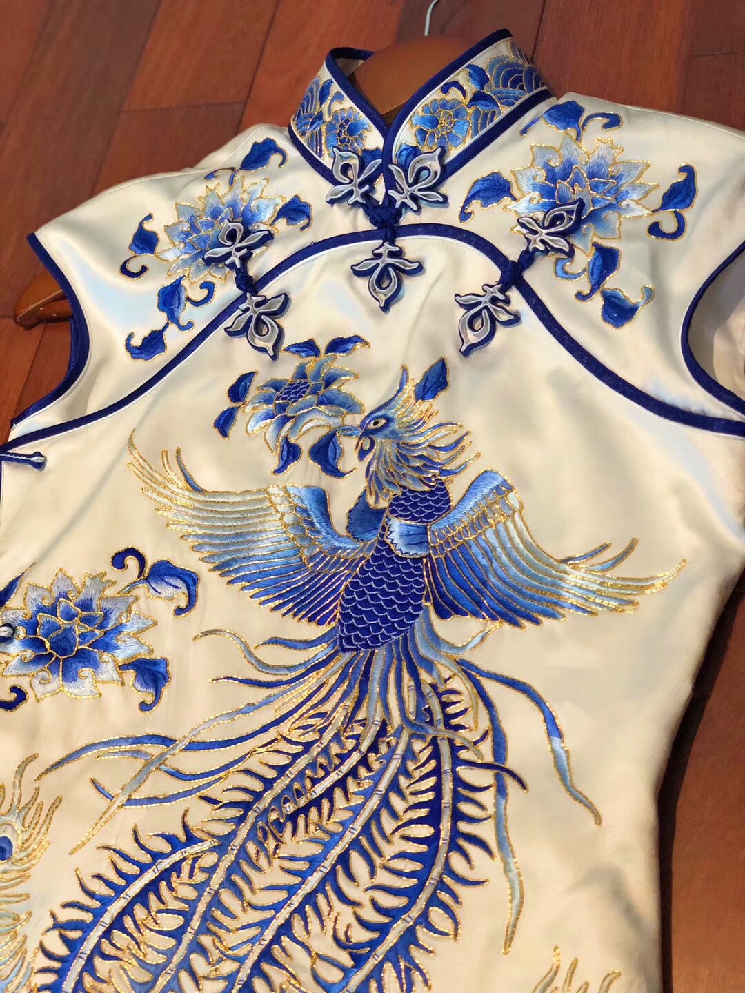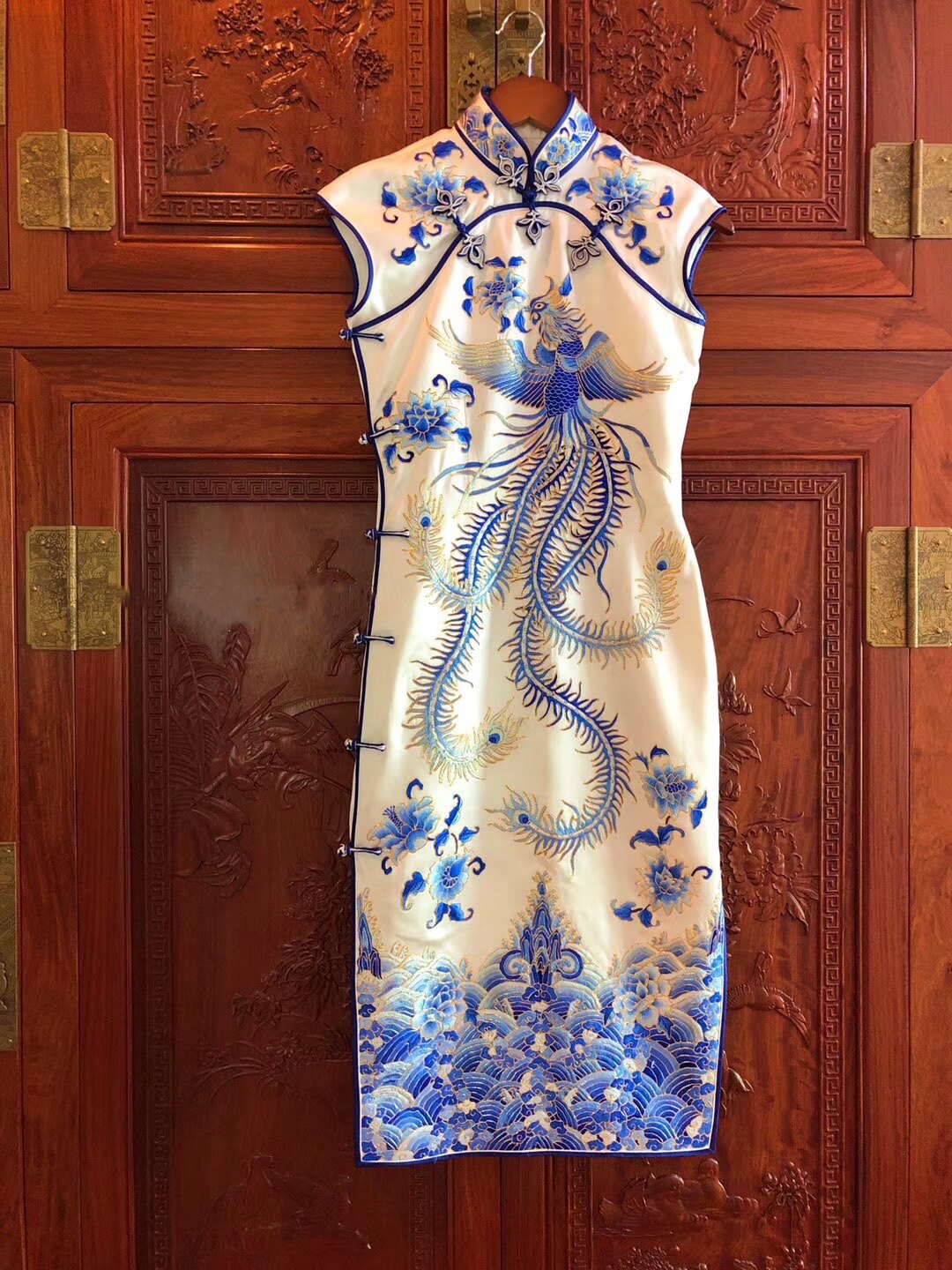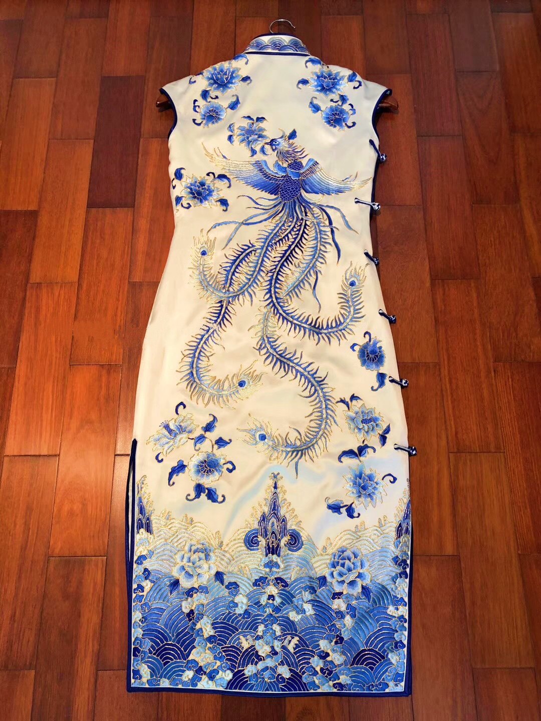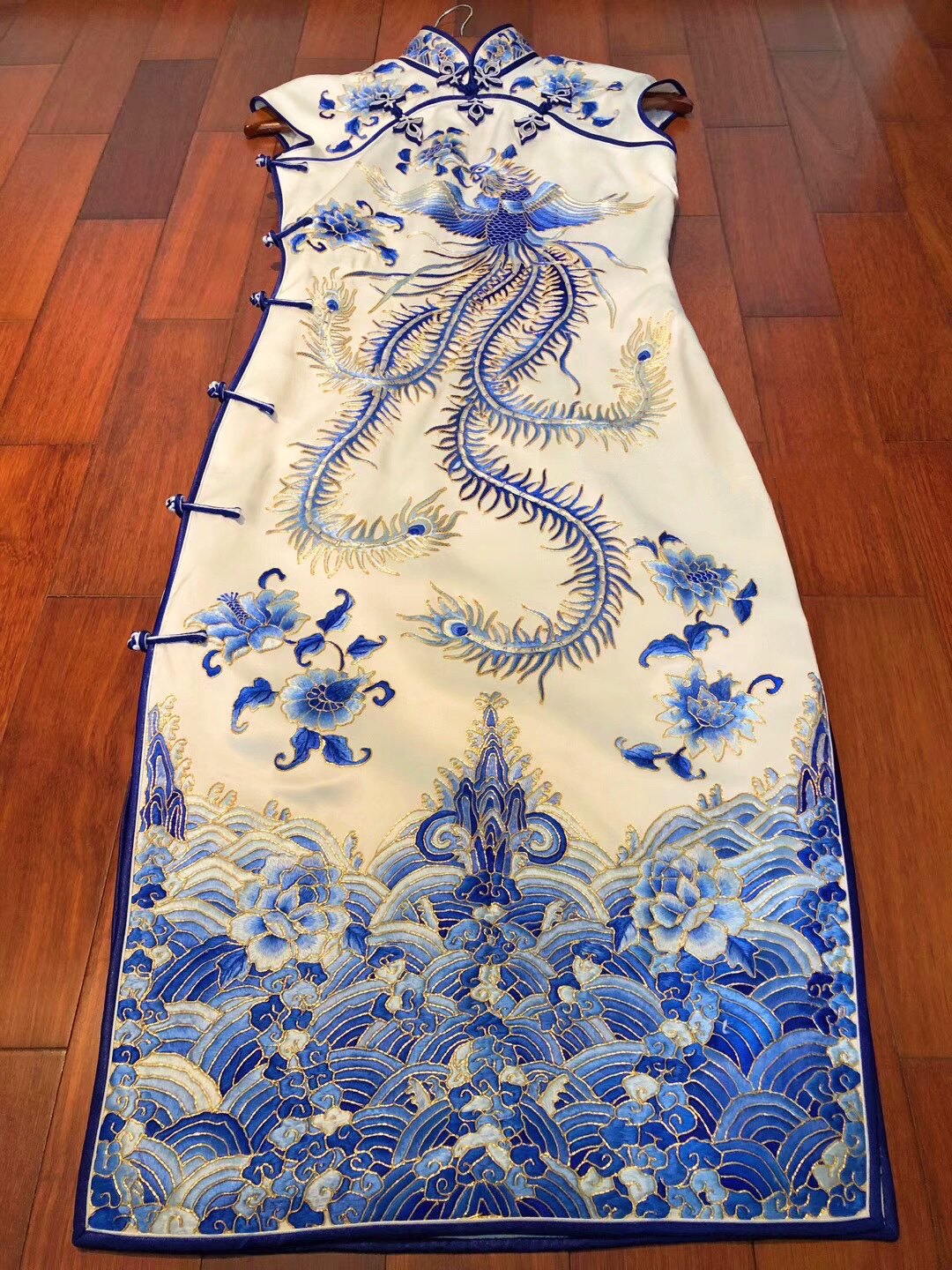 中国风故宫紫禁城真丝手工苏绣京绣三蓝绣凤凰莲花海水旗袍连衣裙