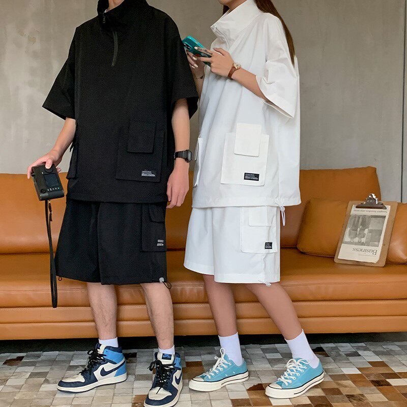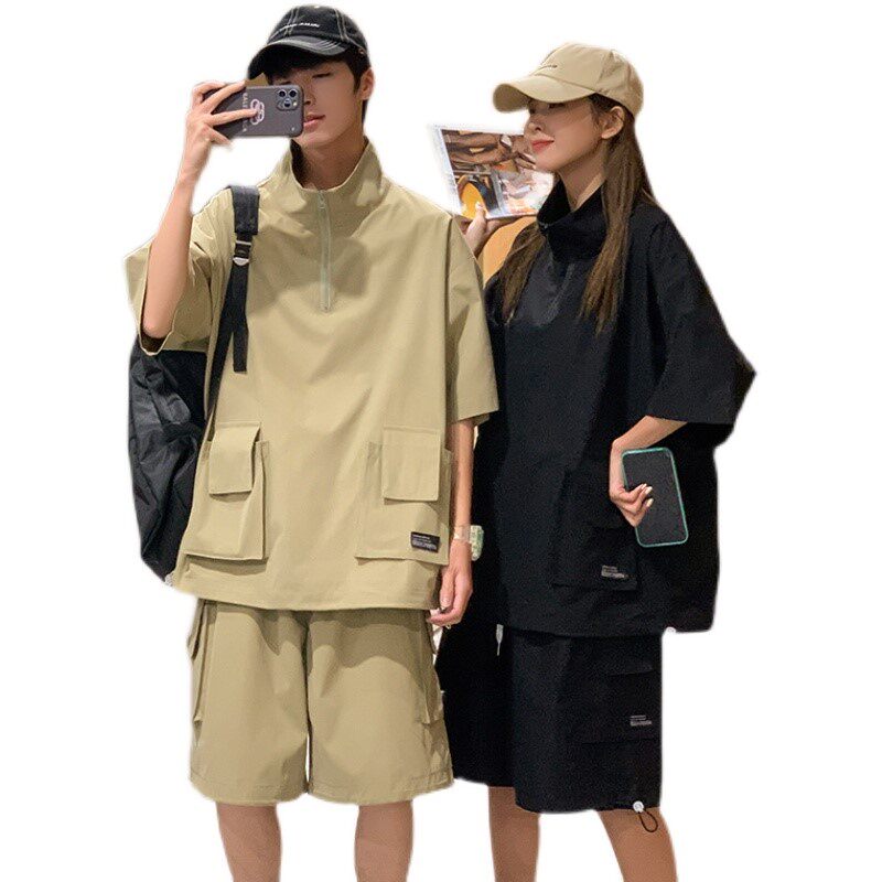 套装 衣服一套休闲潮流半袖 情侣短袖 百搭宽松工装 T恤立领男装 夏季
