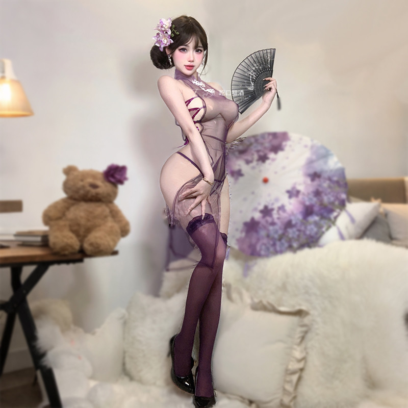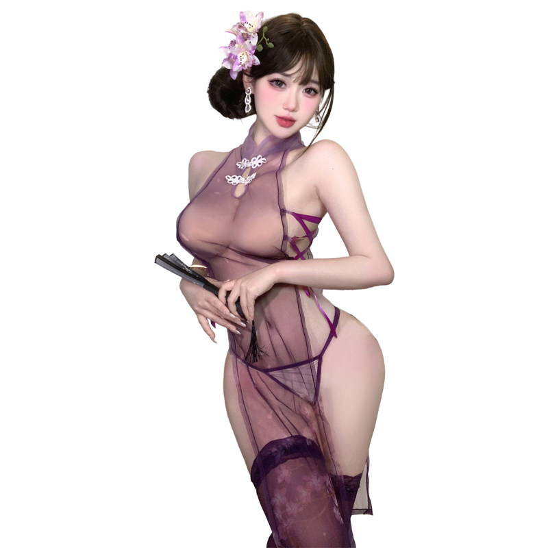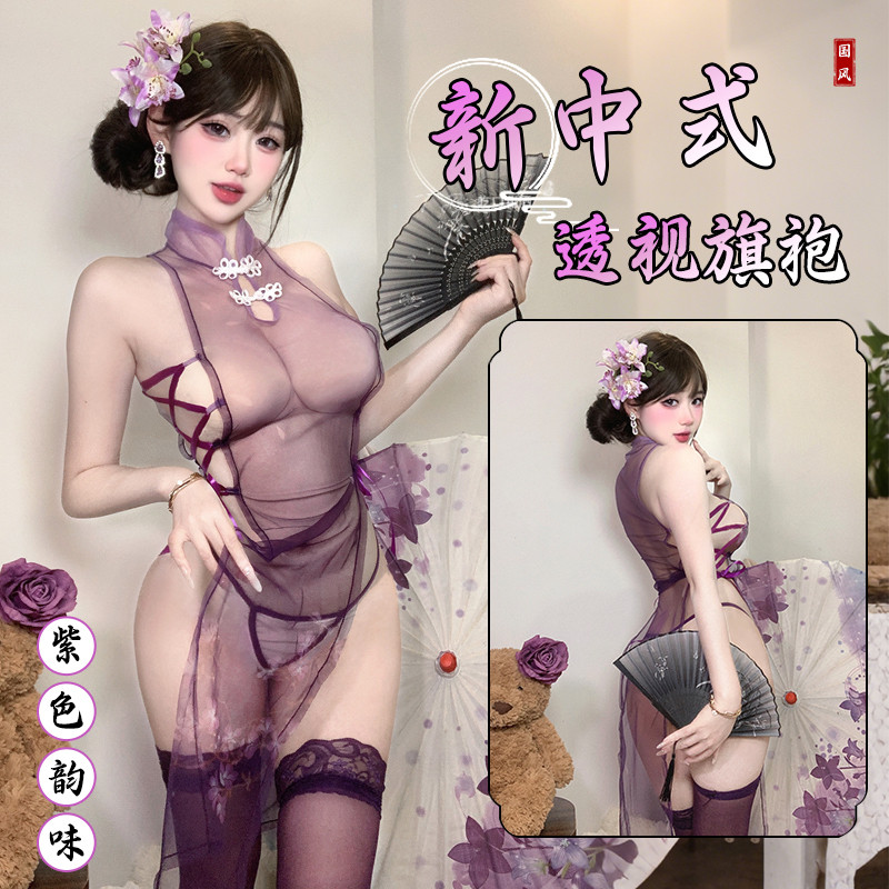 吃口甜酒:紫荆花开 高腰开衩薄纱透视 性感旗袍盘扣镂空绑带睡裙