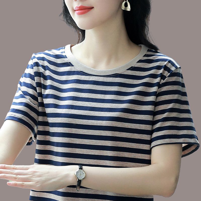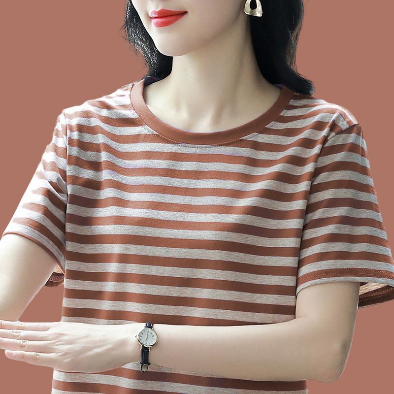 遮肚半袖 纯棉条纹短袖 宽松大码 新款 上衣中年妈妈 T恤女2025年夏装