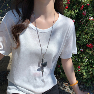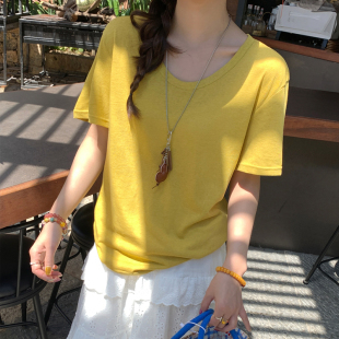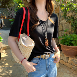 冰丝棉麻上衣 竹节棉宽松半袖 龙妹家绿色V领短袖 T恤女2026春夏新款