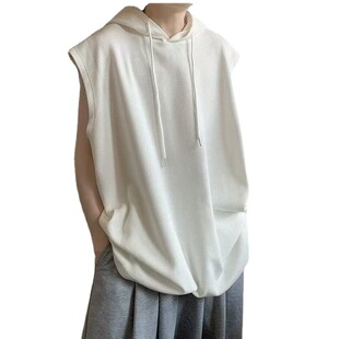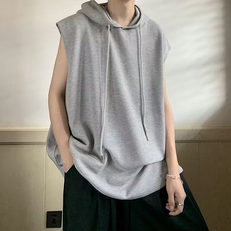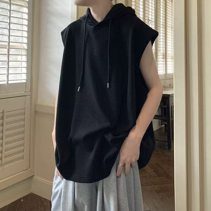 薄款 t恤圆领夏季 休闲连帽背心潮原宿日系华夫格潮流汗无袖 大码