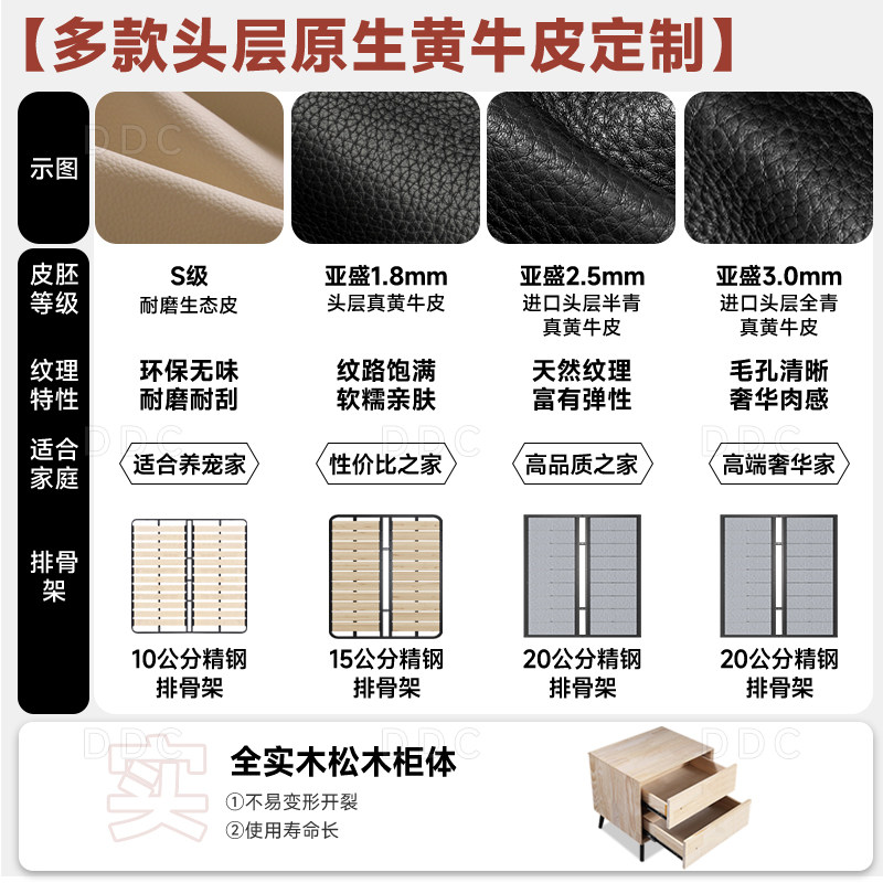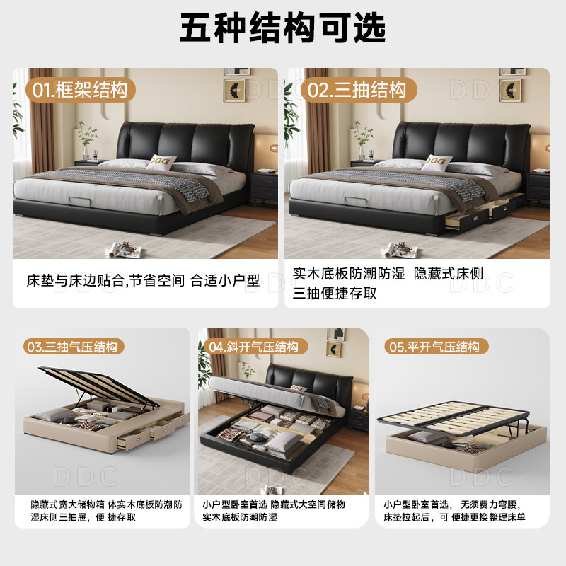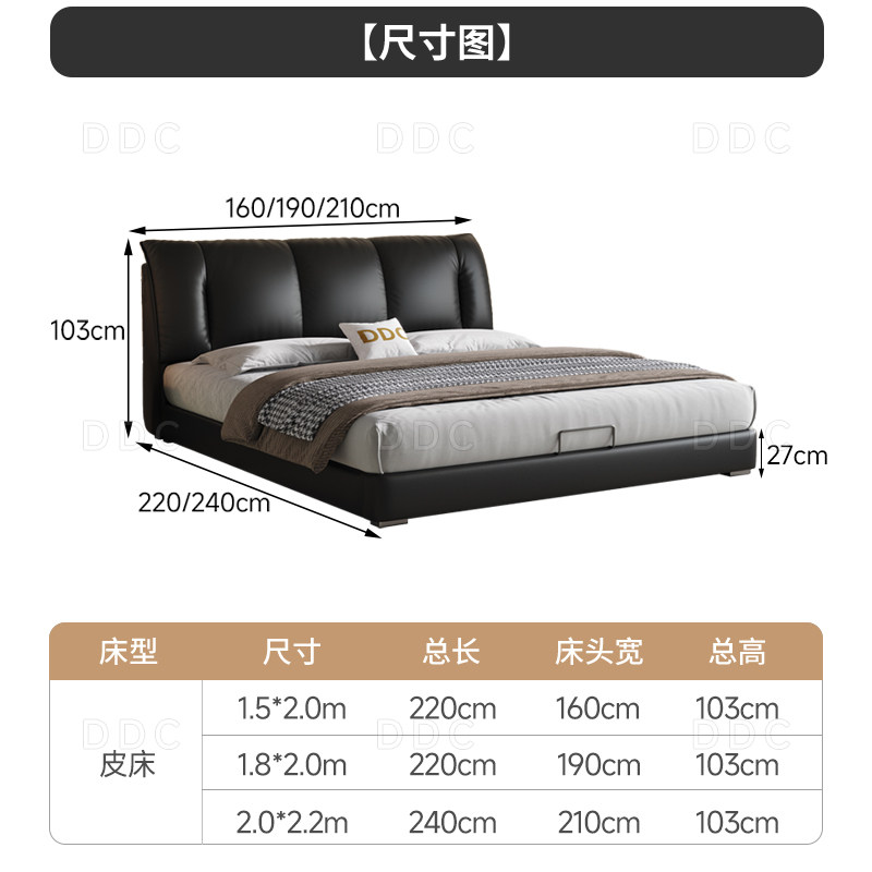 政府补贴DDC黑色真皮床高箱储物床意式 极简主卧床1.8双人床软包床