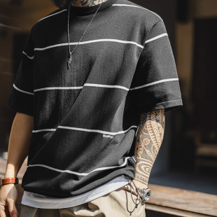 日系圆领短袖 休闲黑白撞色条纹T恤Cityboy半袖 男夏 美式 马登工装