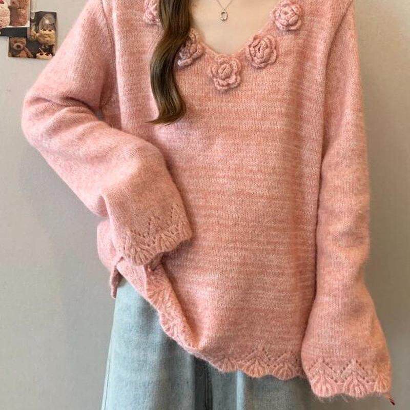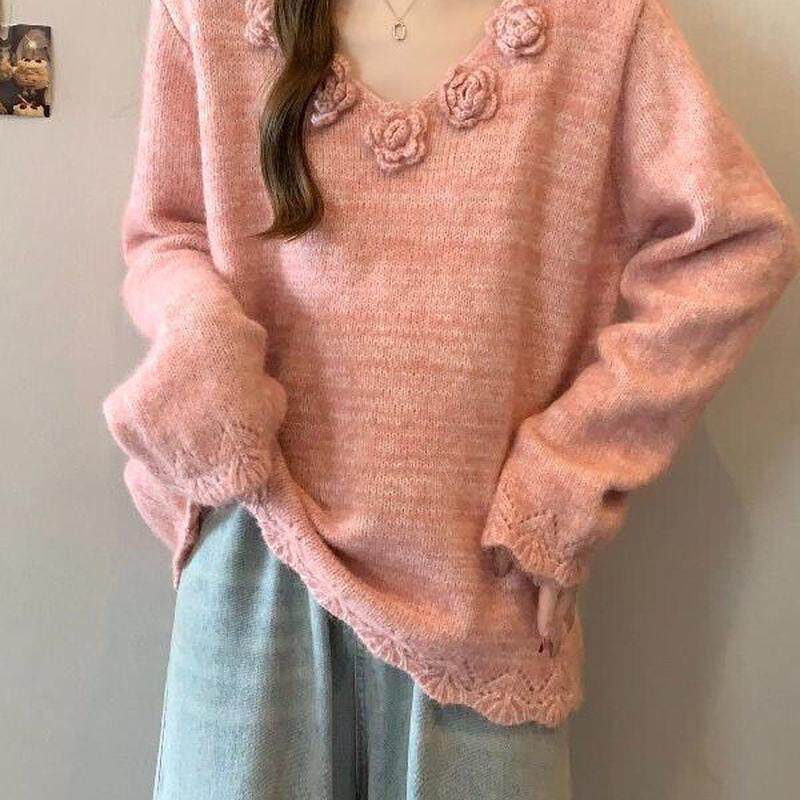 2024秋冬胖中长款 女装 洋气减龄上衣 领毛衣大码 立体花朵针织衫