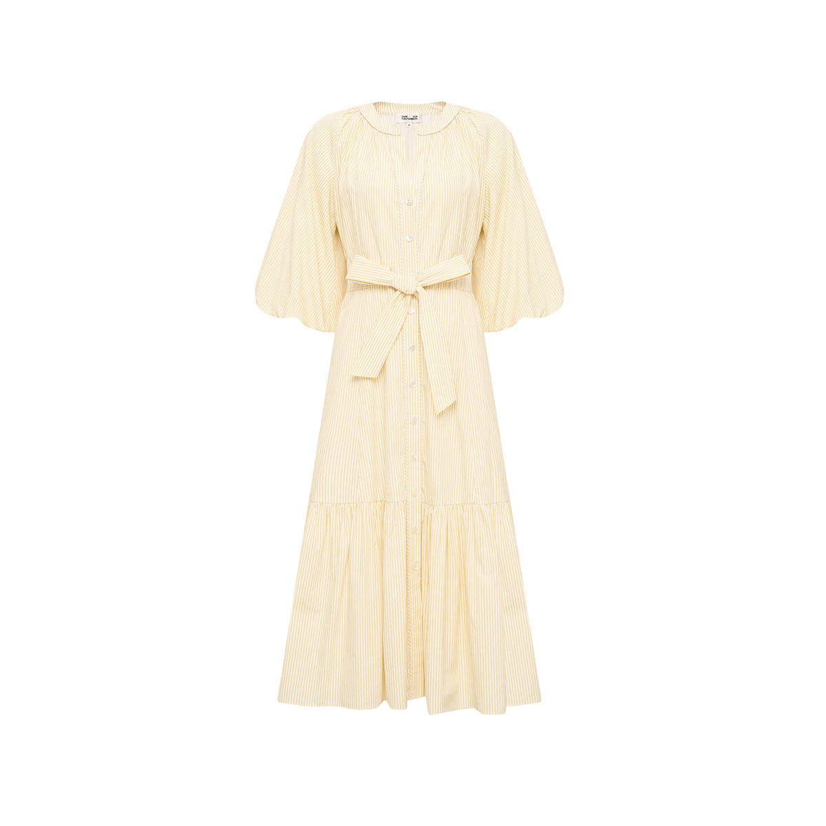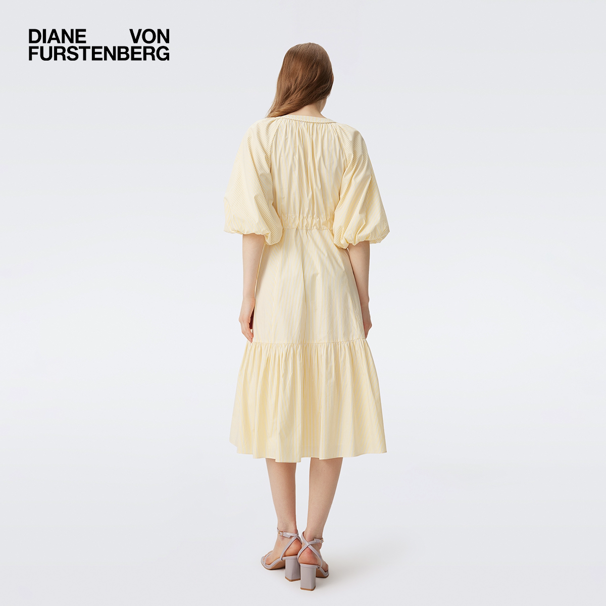 DVF浅黄色夏日条纹印花圆领V字领口灯笼袖 度假风连衣裙DS1T003