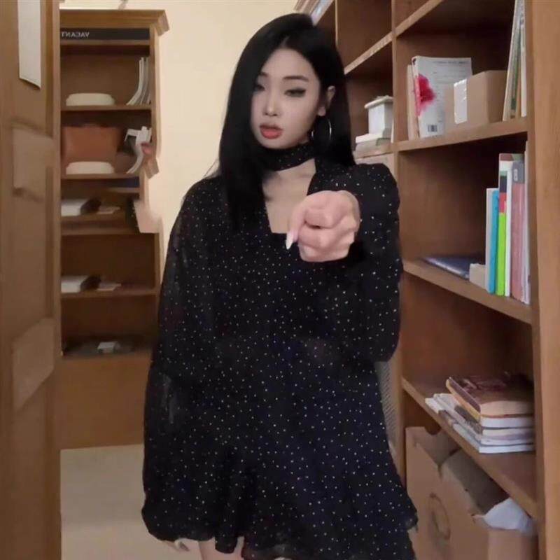 法式 连衣裙女夏季 独特绝美气质收腰短裙 黑色波点飘带雪纺长袖 大码