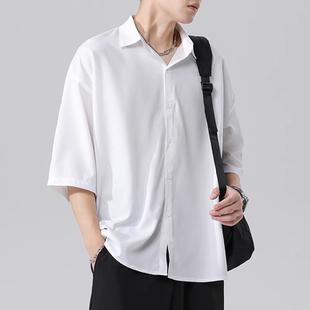 黑色潮流透气宽松休闲五分袖 冰丝短袖 薄款 男夏季 痞帅白色衬衣 衬衫