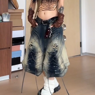 男女朋克街头水洗做旧阔腿中裤 设计感破洞绑带牛仔七分裤 美式 大码
