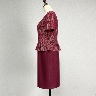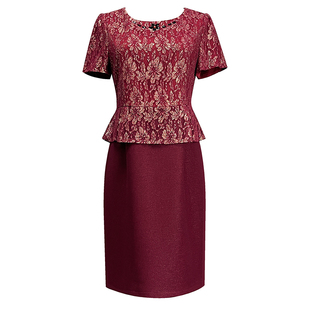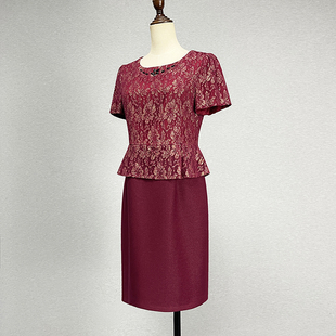 显瘦洋气百搭直筒裙 蕾丝连衣裙女2025小香风修身 中长款 酒红色短袖