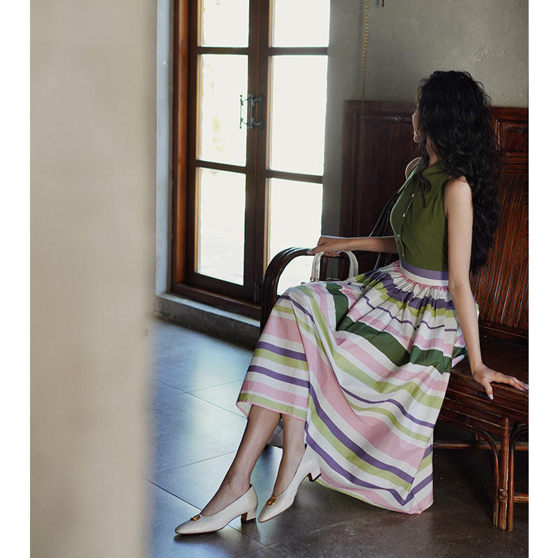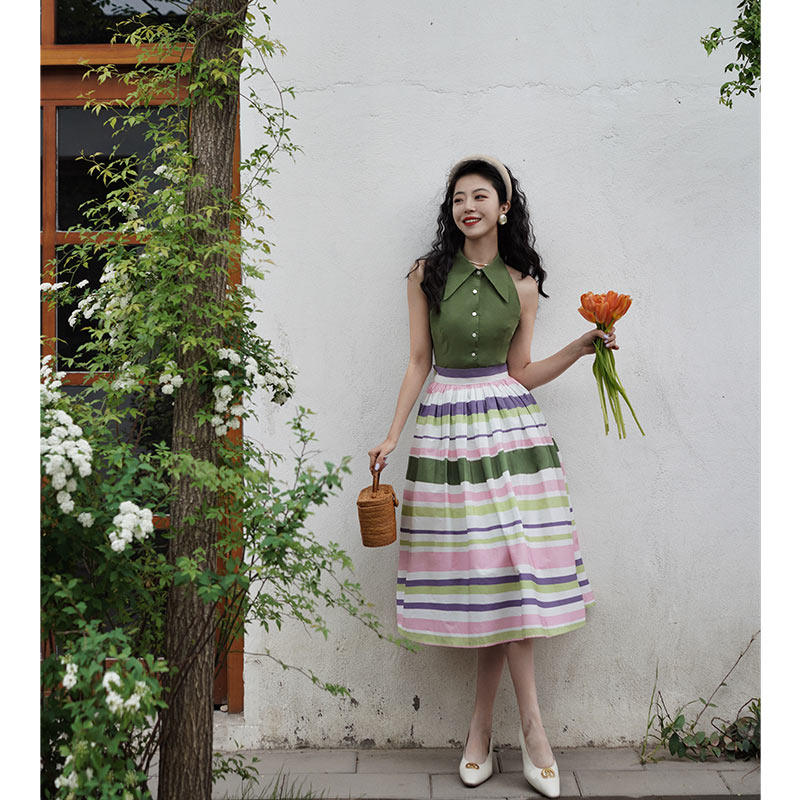 Chings复刻1950年代vintage彩色条纹半裙 赫本风显瘦高腰大摆裙夏