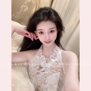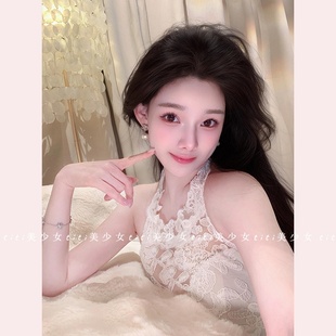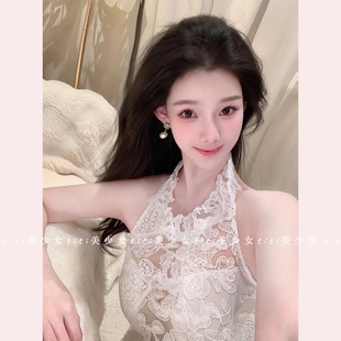 镂空修身 小白花蕾丝钩花美背挂脖背心秋季 白色上衣 TiTi美少女