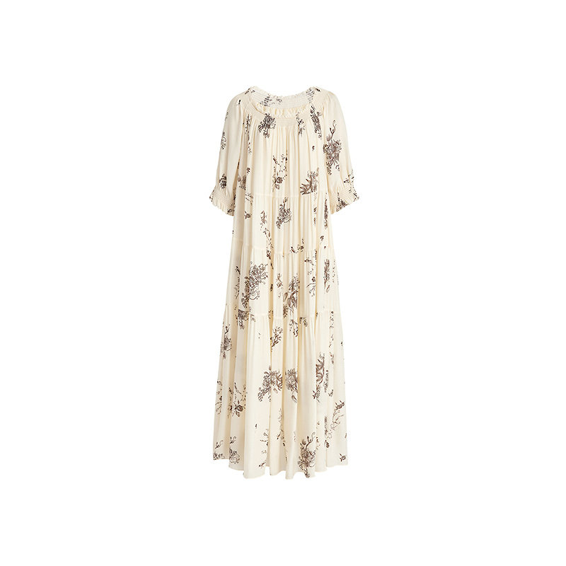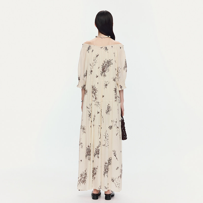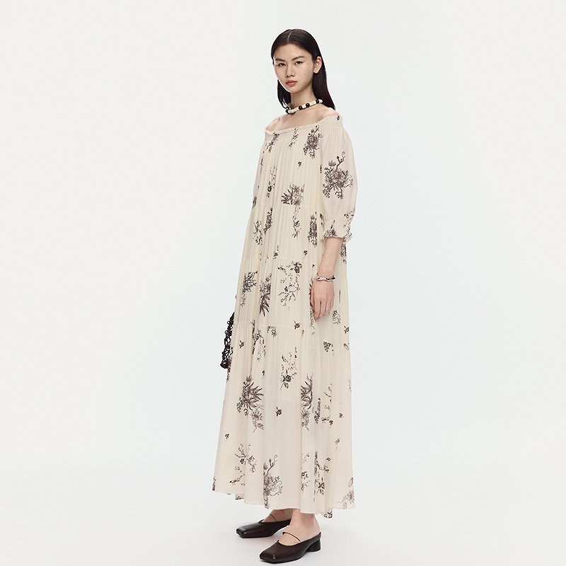 桑蚕丝一字肩枝蔓印花连衣裙子 AUM噢姆夏季 FaFa裙