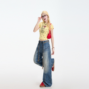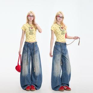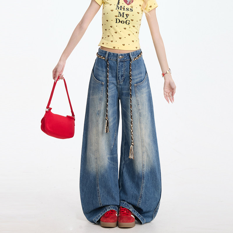 高街做旧阔腿显瘦休闲裤 弯刀裤 女复古解构美式 NERESUM蓝色牛仔裤