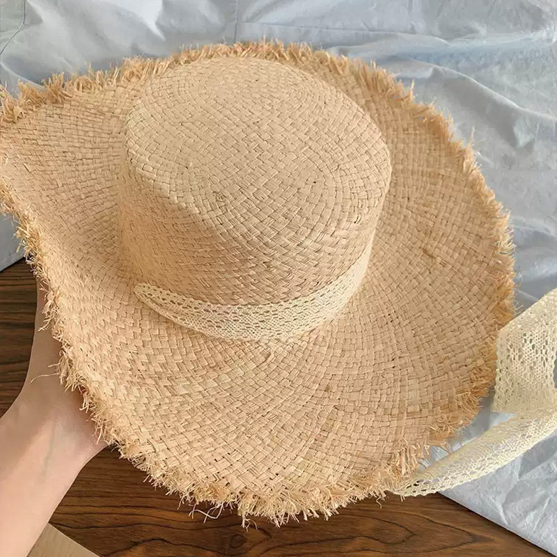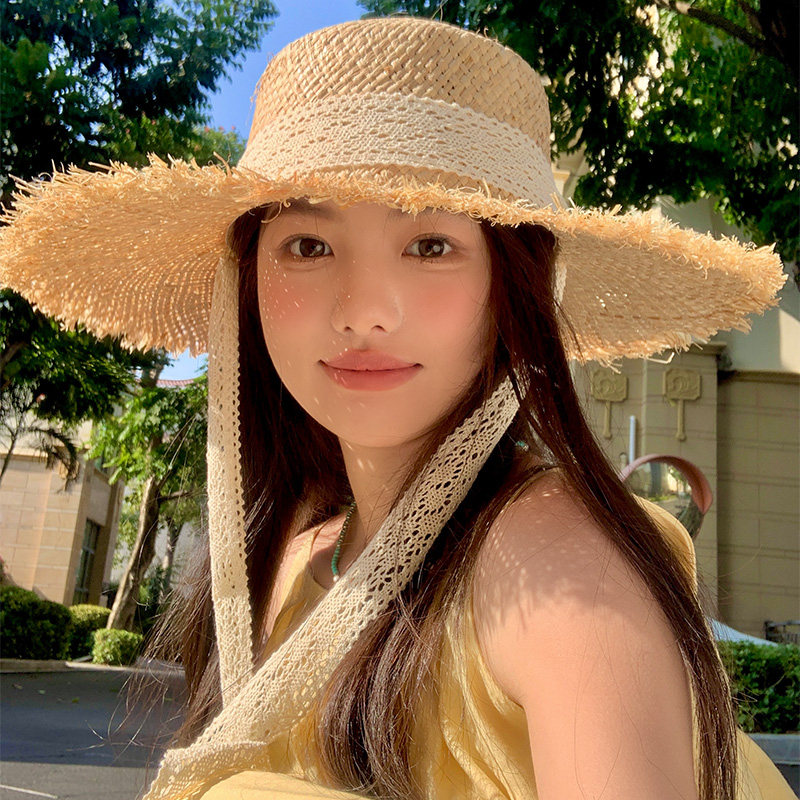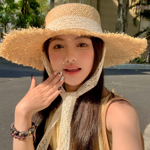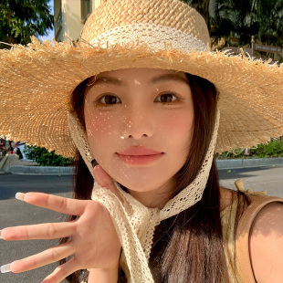 法式 海边度假沙滩大帽檐太阳帽子 蕾丝平顶拉菲草帽女2026年春新款