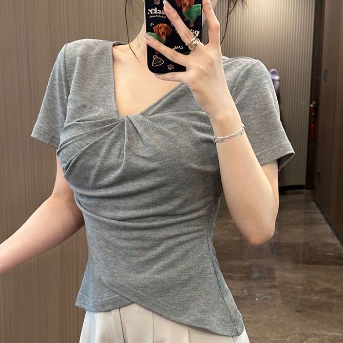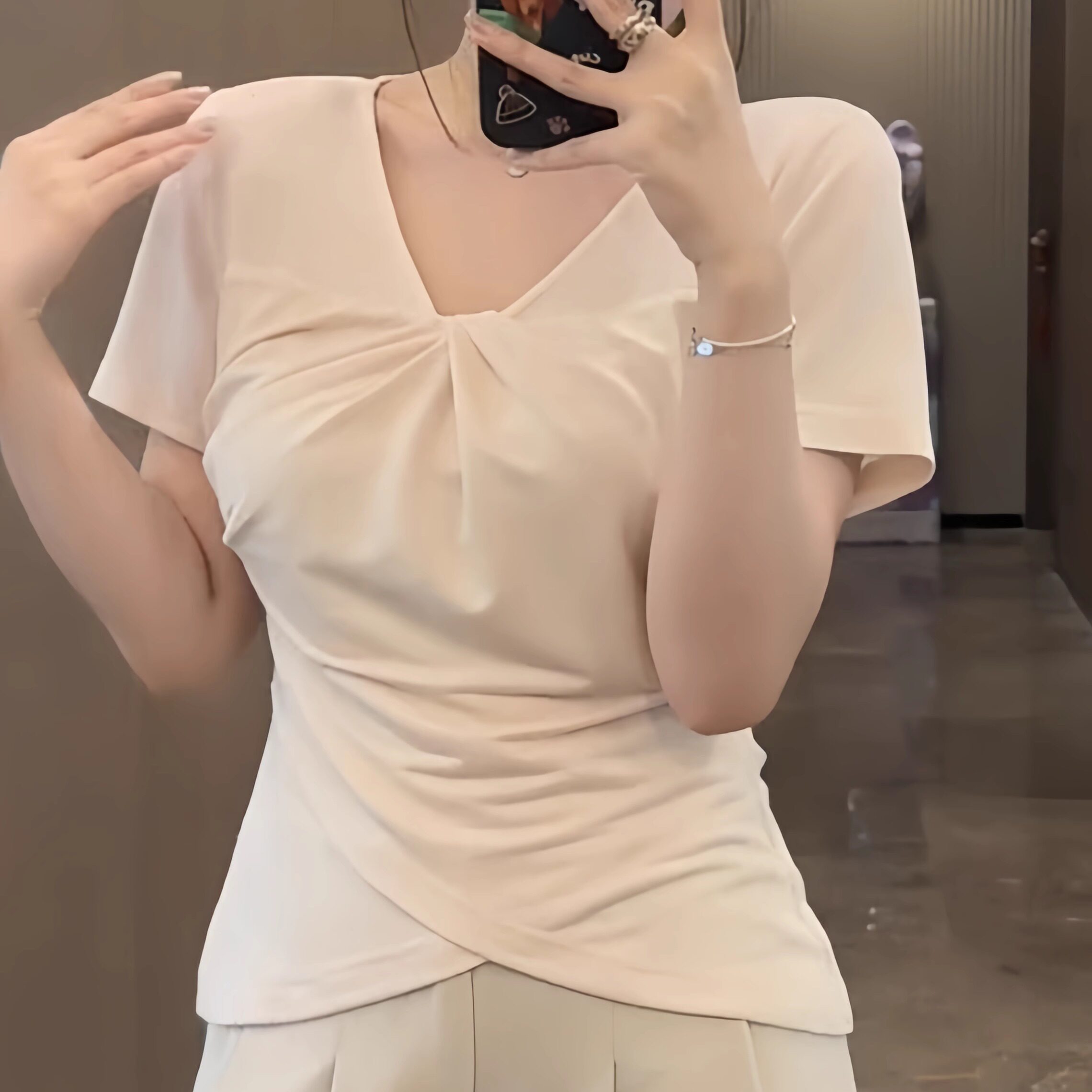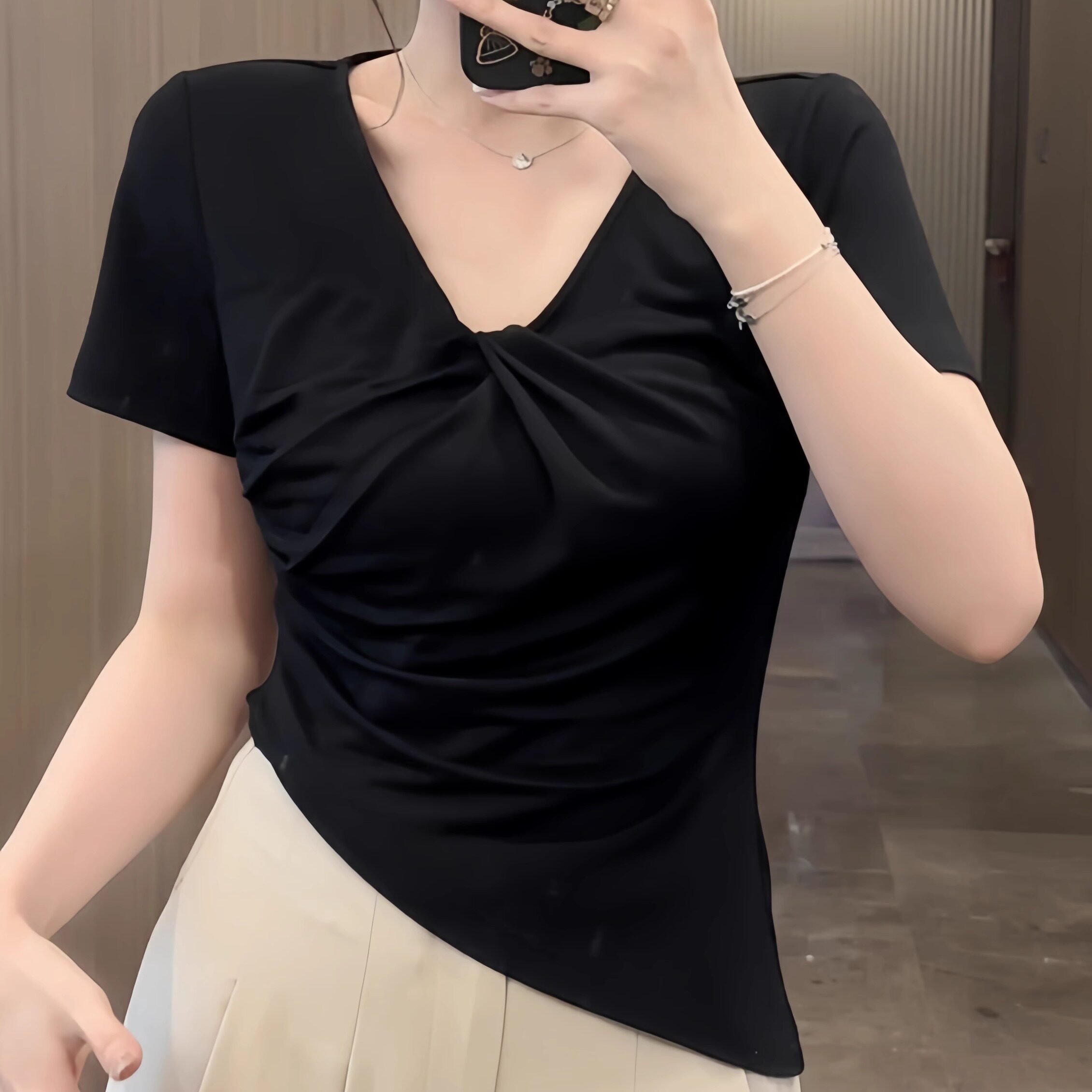 设计感v领短袖 夏季 T恤胖mm遮肉显瘦独特别致上衣女2 女装 300斤大码