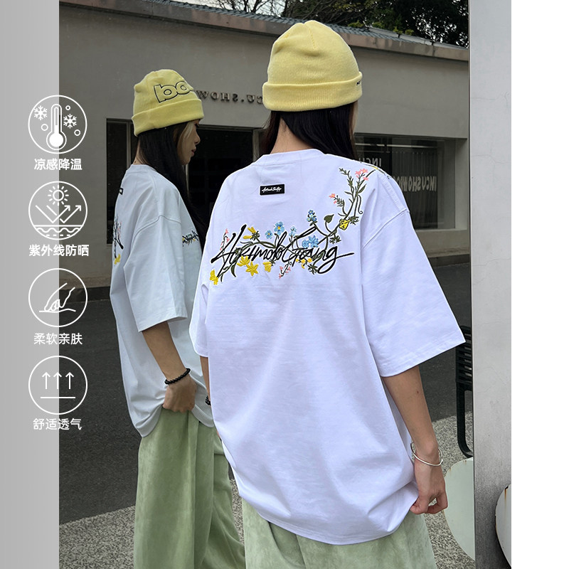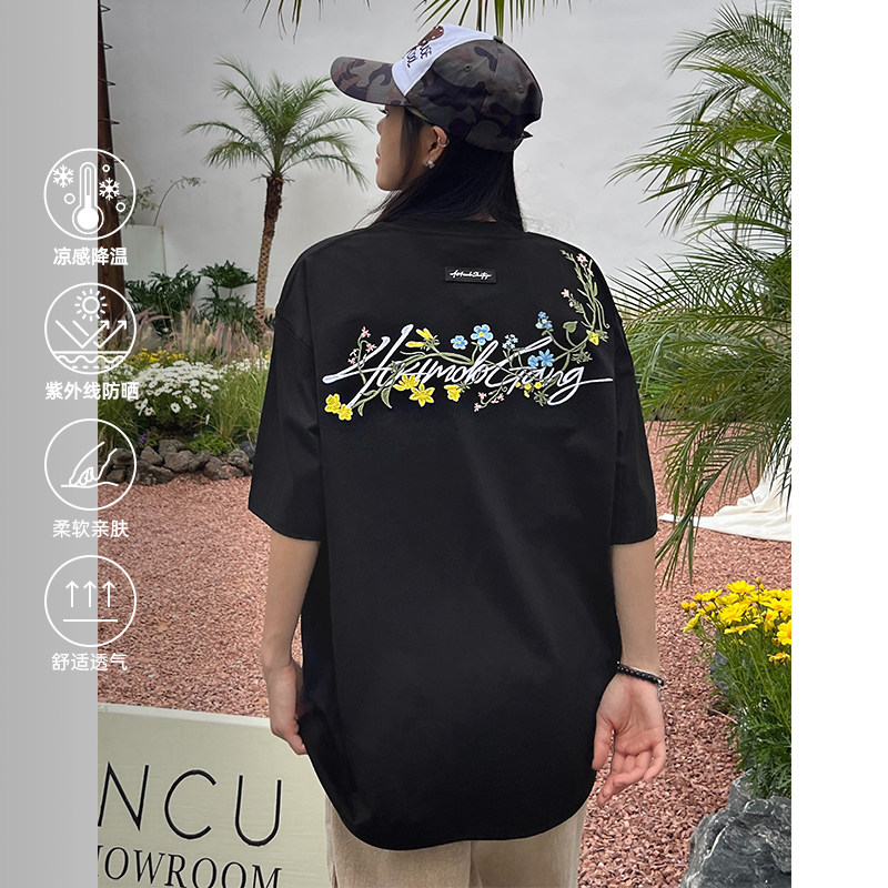 美式 T恤男女款 404MOB手写花卉刺绣短袖 宽松凉感防晒t 章若楠同款