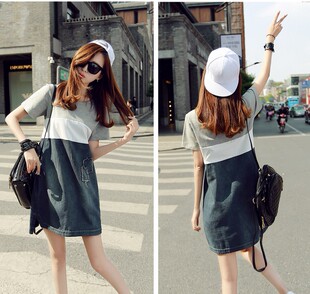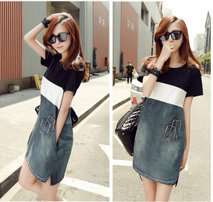 新款 女装 短袖 大码 显瘦A字打底短裙 拼接牛仔连衣裙女韩版 2022夏季
