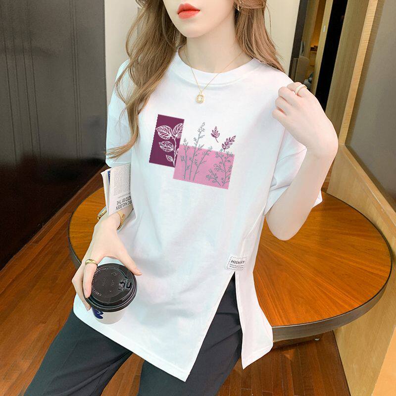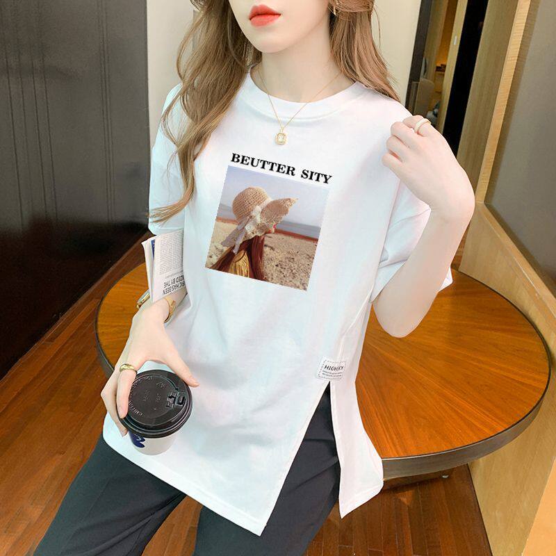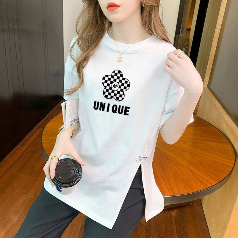 设计感不规则百搭白色开叉ins上衣女士 T恤女时尚 夏季 100%纯棉短袖