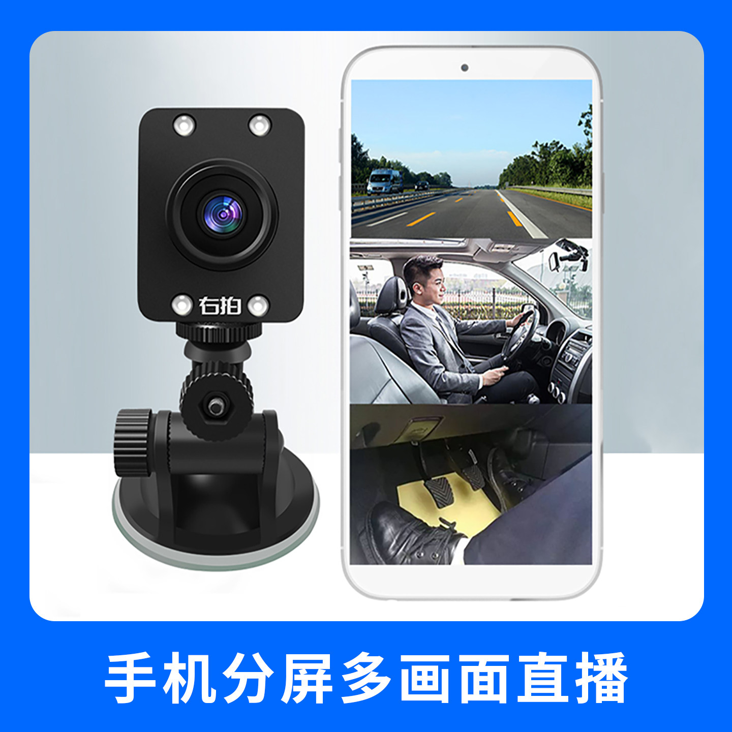 右拍C30车载摄像头驾校教练网约车抖音安卓苹果手机分屏直播设备