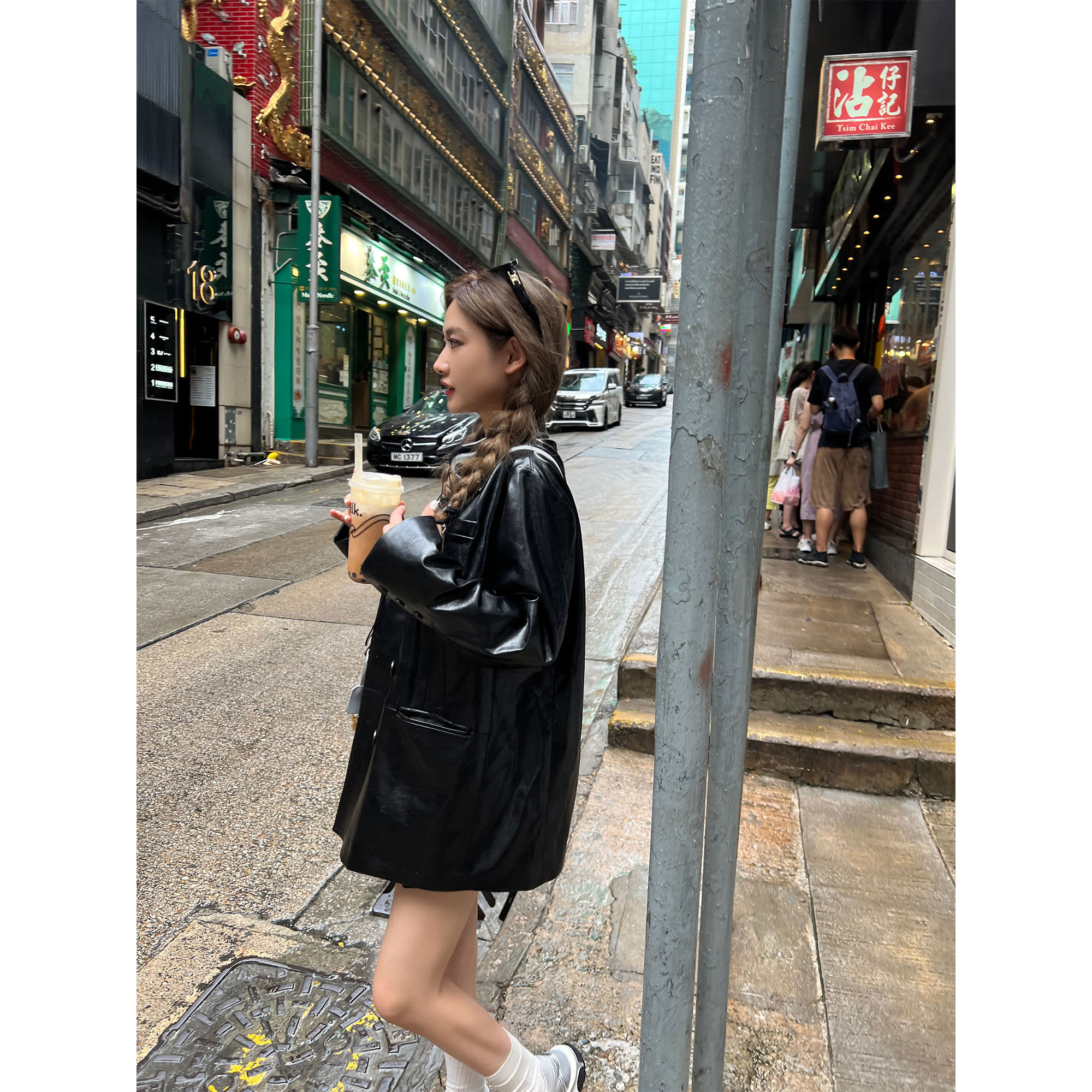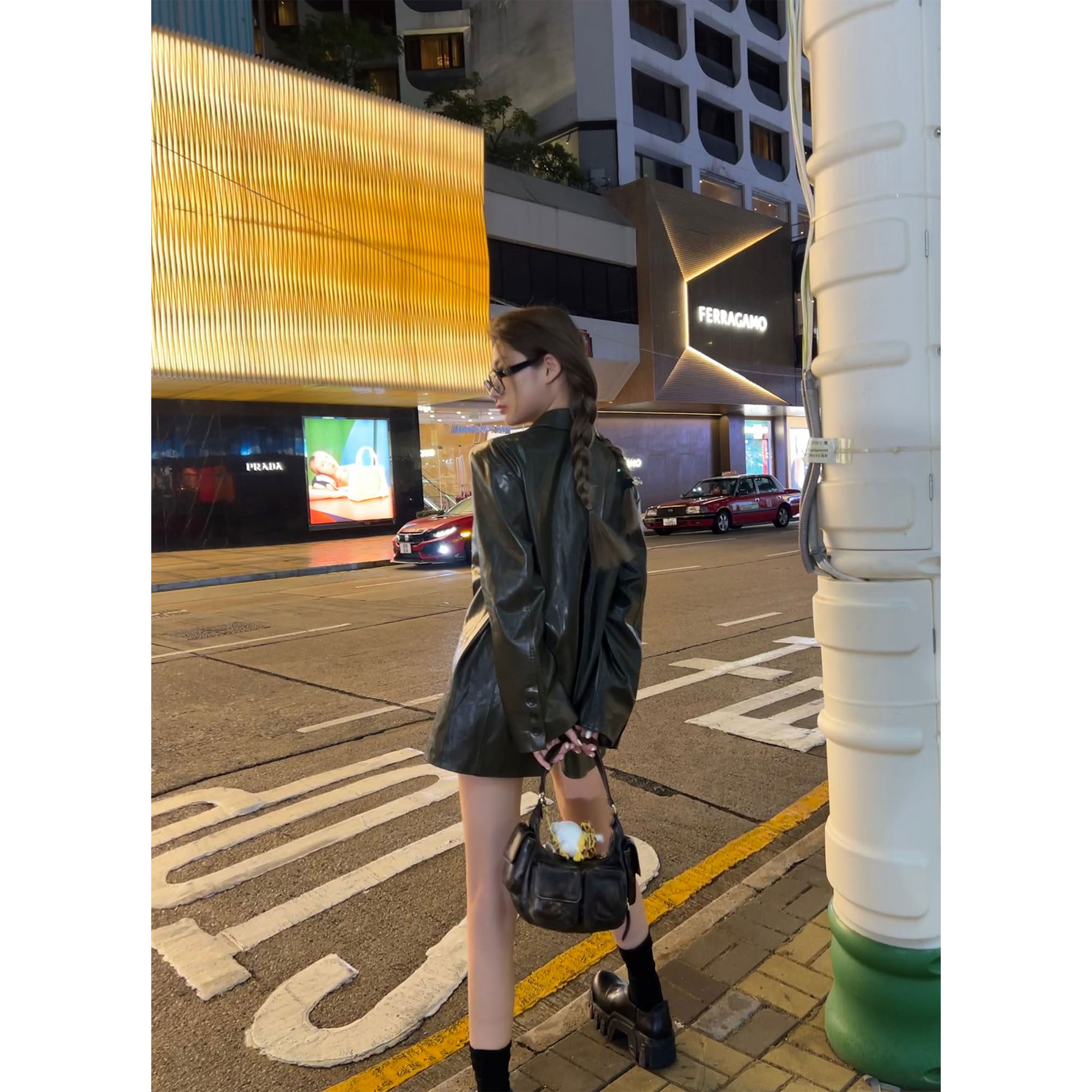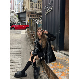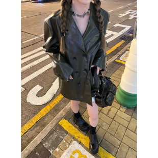 廓形长袖 落日油画感黑色绿色pu皮质西装 外套皮衣 Lin Xinlei