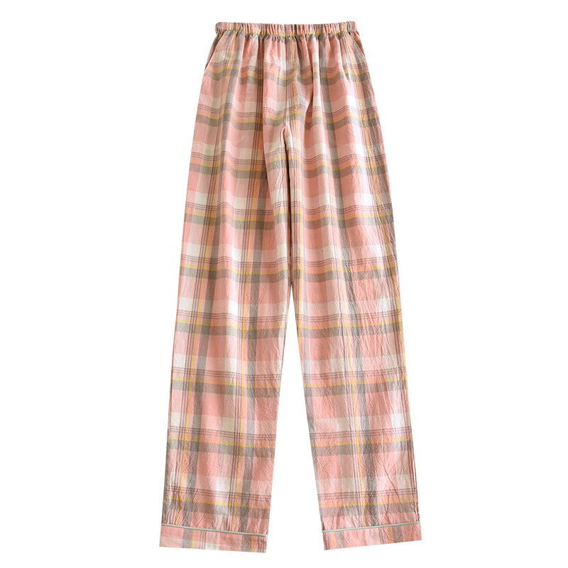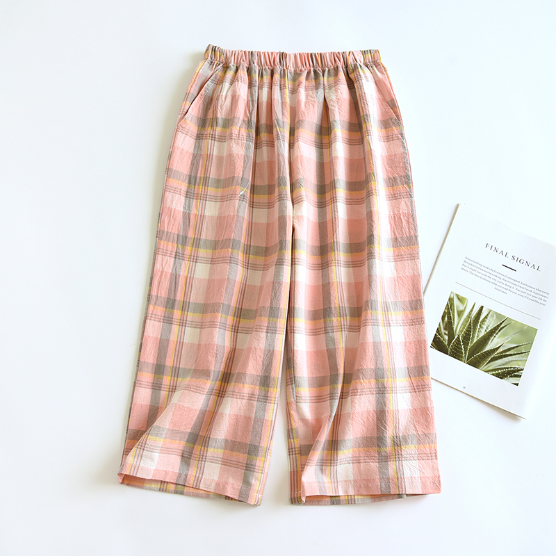 日系格子休闲透气七分裤 长裤 可外穿 宽松薄款 春夏女纯棉水洗棉睡裤