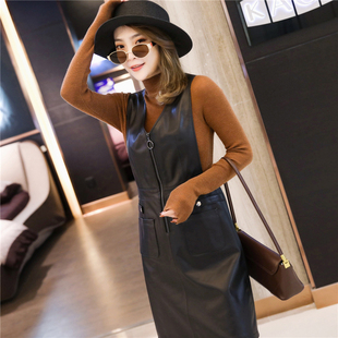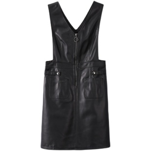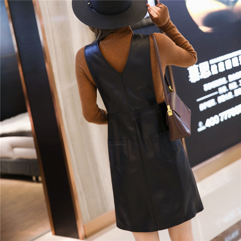 连衣裙女秋冬新款 中长裙V领显瘦背带裙 绵羊皮黑色背心裙真皮修身