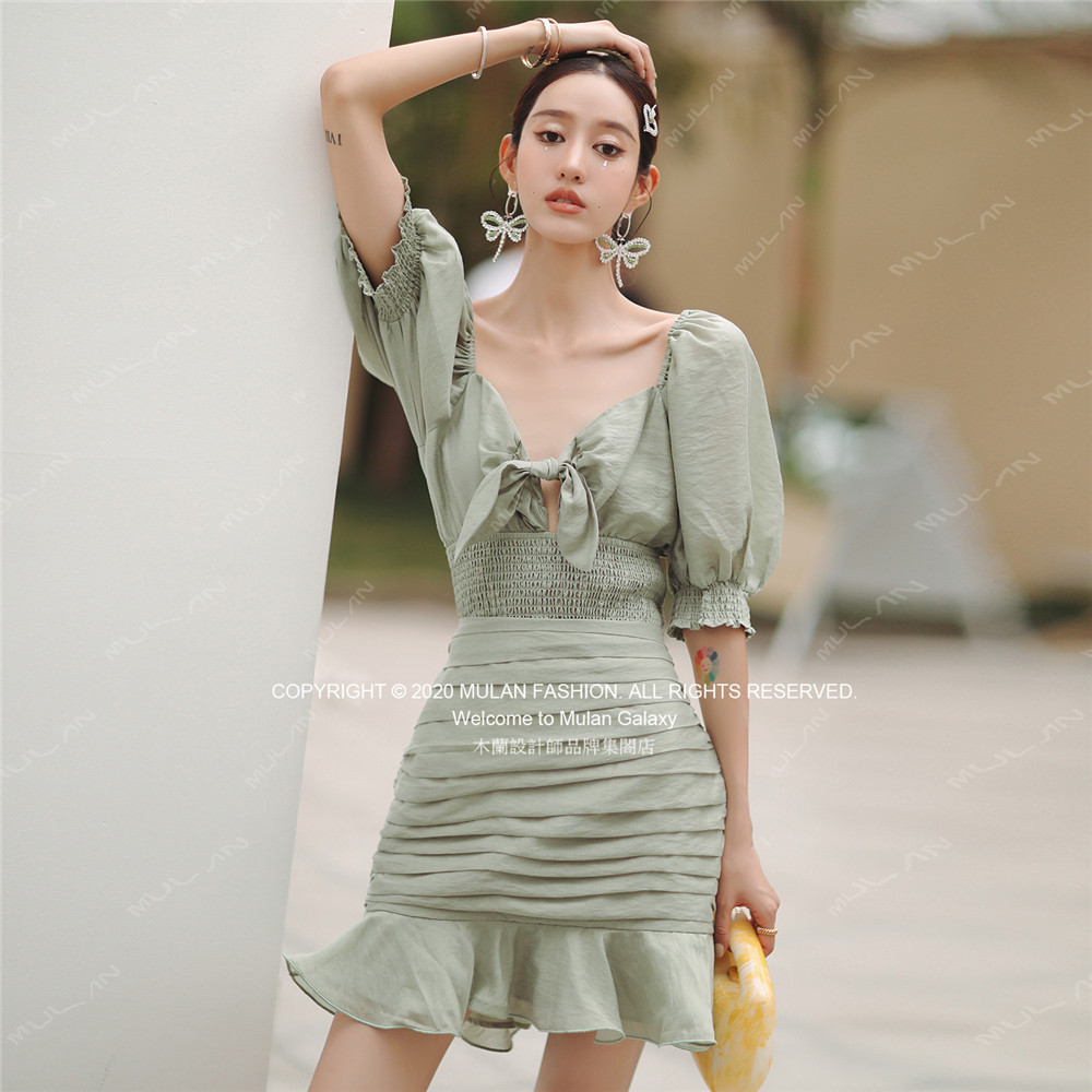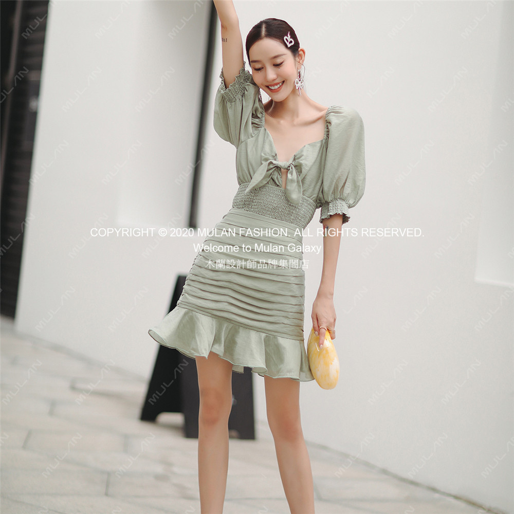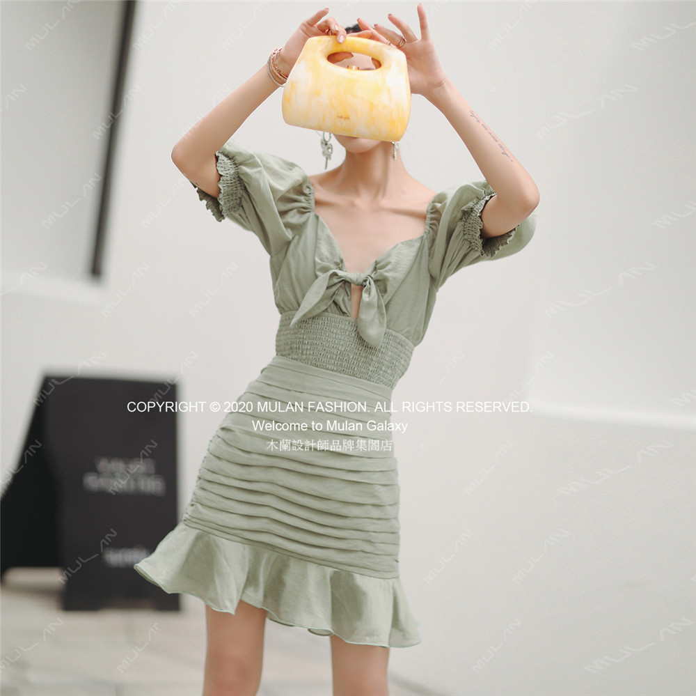 短袖 CHASE泡泡袖 Keepsake新款 低胸系结上衣鱼尾荷叶边半裙 折