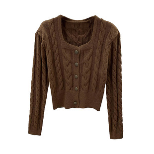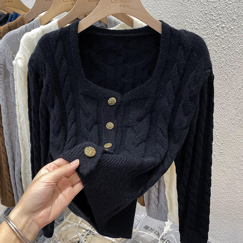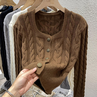 方领小香风宽松白色加厚打底复古麻花毛衣 女法式 2022冬季 针织开衫