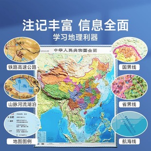 学生地理百科墙贴 饰高清精雕超大凹槽挂图地图初中高中小学生通用凹凸竖版 时光学中国地图和世界地图新版 3D立体墙贴地图墙面装