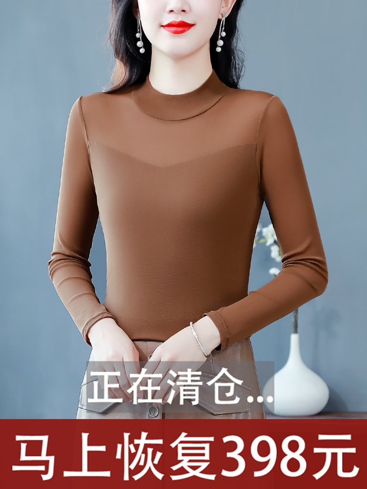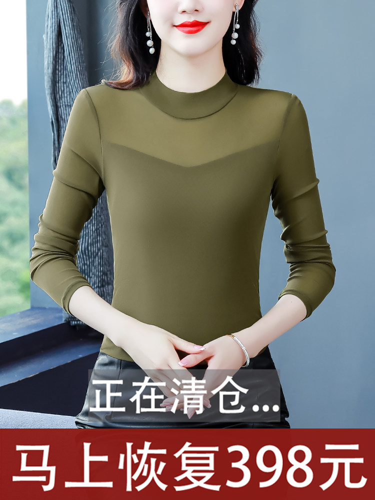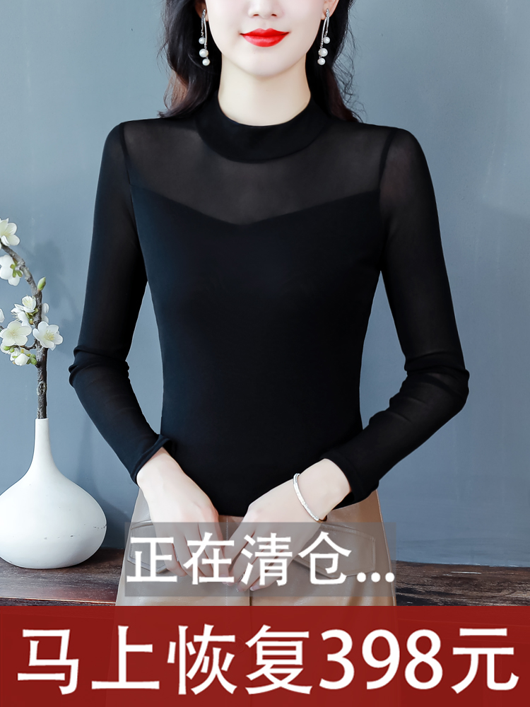 女春夏装 t恤百搭洋气小衫 新款 网纱上衣长袖 内搭修身 半高领打底衫