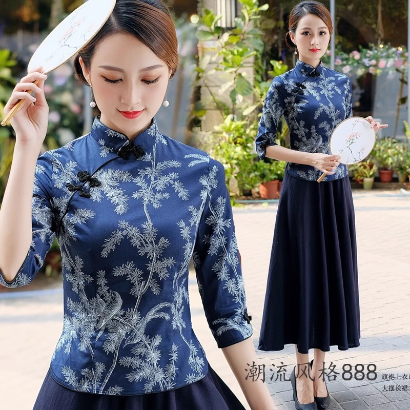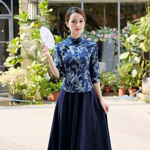 印花复古名族风打底衫 旗袍上衣中式 七分袖 女式 改良两件套旗袍 唐装