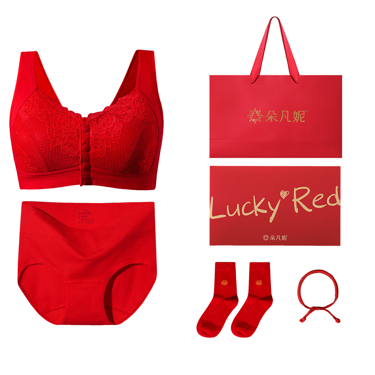 马 红色中老年人前扣文胸纯棉内裤 朵凡妮妈妈本命年内衣套装 女大码