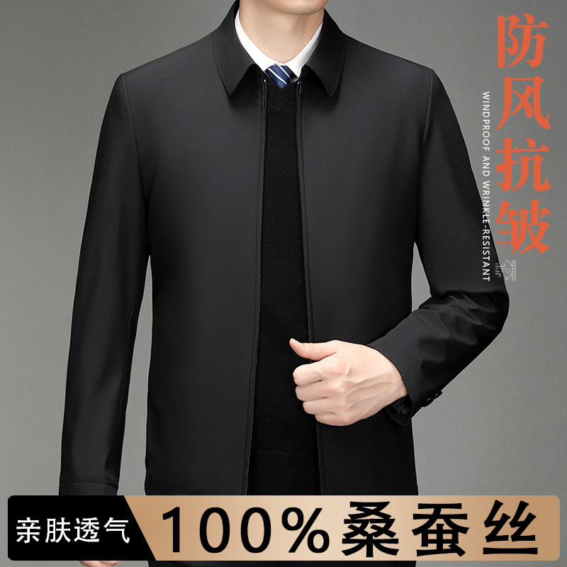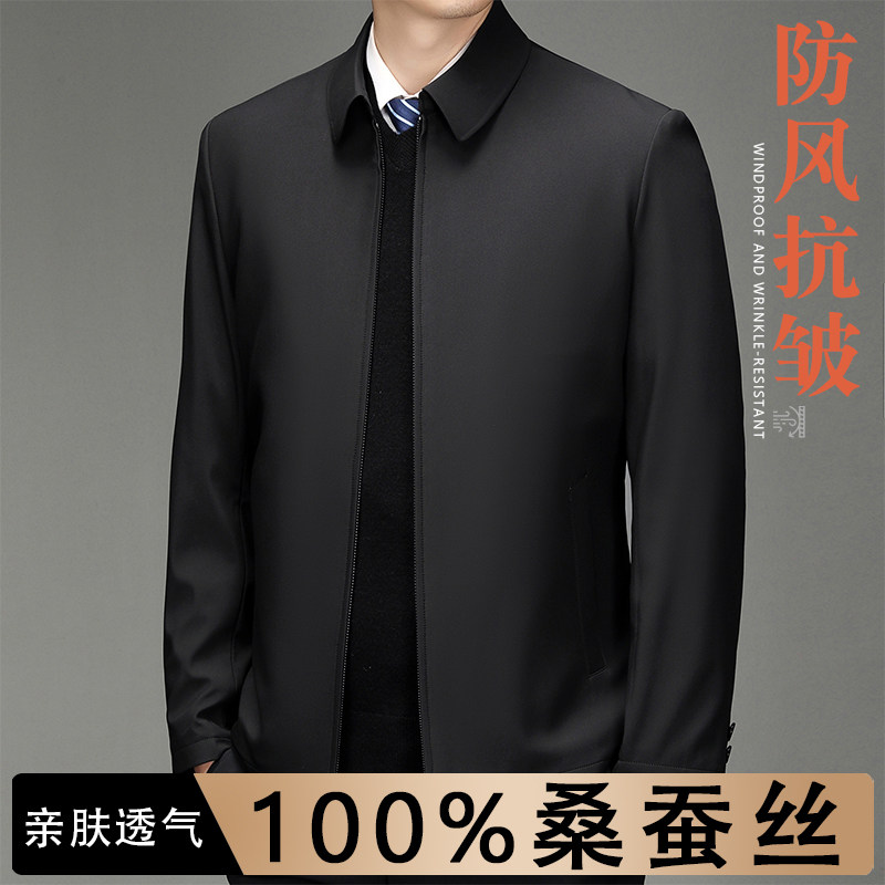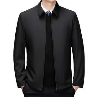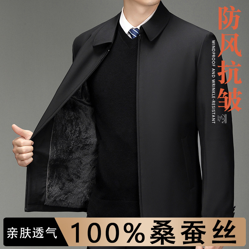 加绒上衣 休闲拉链外套中年桑蚕丝翻领商务夹克爸爸装 秋冬款 男士